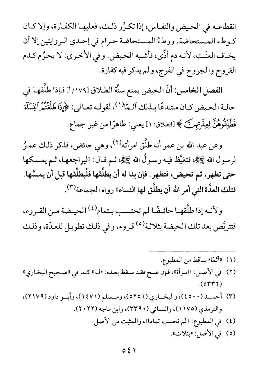 الفصل الخامس: أنّ الحيض يمنع سنَّة الطلاق [١٧٩/أ] فإذا طلَّقها في حالة الحيض كان مبتدعًا بذلك آثمًا (¬١)، لقوله تعالى: {إِذَا طَلَّقْتُمُ النِّسَاءَ فَطَلِّقُوهُنَّ لِعِدَّتِهِنَّ} [الطلاق: ١] يعني: طاهرًا من غير جماع.