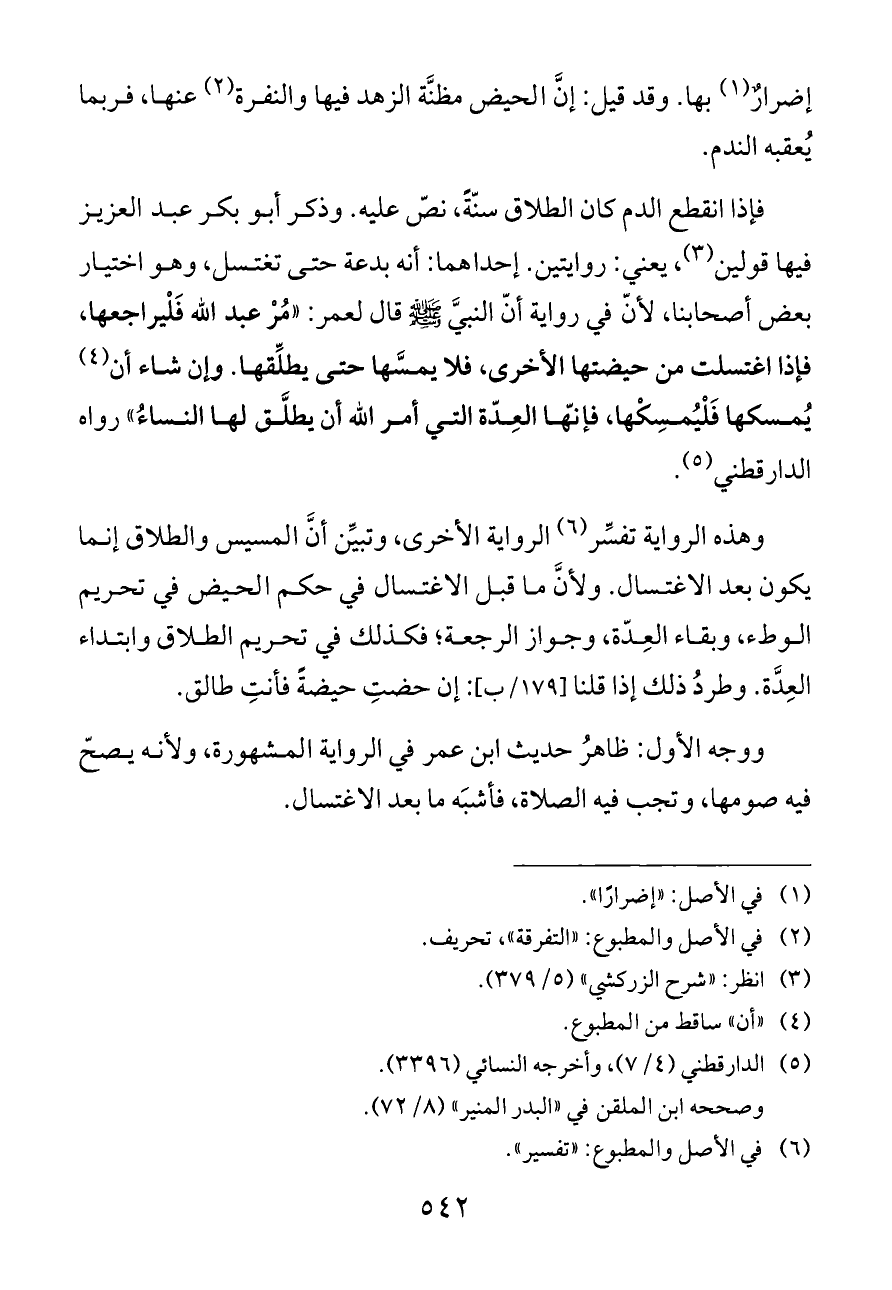 فإذا انقطع الدم كان الطلاق سنّةً، نصّ عليه. وذكر أبو بكر عبد العزيز فيها قولين (¬٣)، يعني: روايتين. إحداهما: أنه بدعة حتى تغتسل، وهو اختيار بعض أصحابنا، لأنّ في رواية أنّ النبيَّ - صلى الله عليه وسلم - قال لعمر: «مُرْ عبد الله فَلْيراجعها، فإذا اغتسلت من حيضتها الأخرى، فلا يمسَّها حتى يطلِّقها. وإن شاء أن (¬٤) يُمسكها فَلْيُمسِكْها، فإنّها العِدّة التي أمر الله أن يطلَّق لها النساءُ» رواه الدارقطني (¬٥).