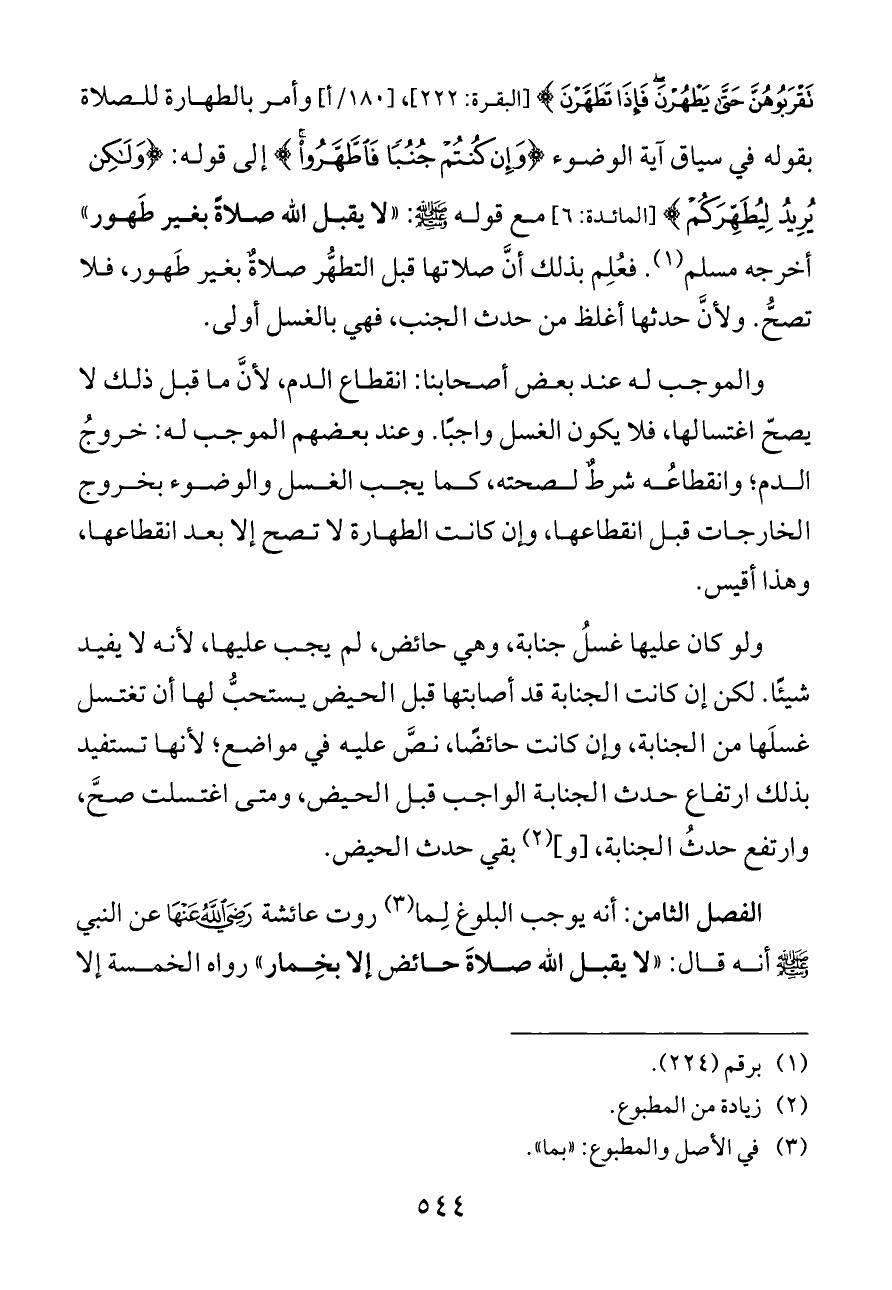 تَقْرَبُوهُنَّ حَتَّى يَطْهُرْنَ فَإِذَا تَطَهَّرْنَ} [البقرة: ٢٢٢]، [١٨٠/أ] وأمر بالطهارة للصلاة بقوله في سياق آية الوضوء {وَإِنْ كُنْتُمْ جُنُبًا فَاطَّهَّرُوا} إلى قوله: {وَلَكِنْ يُرِيدُ لِيُطَهِّرَكُمْ} [المائدة: ٦] مع قوله - صلى الله عليه وسلم -: «لا يقبل الله صلاةً بغير طَهور» أخرجه مسلم (¬١). فعُلِم بذلك أنَّ صلاتها قبل التطهُّر صلاةٌ بغير طَهور، فلا تصحُّ. ولأنَّ حدثها أغلظ من حدث الجنب، فهي بالغسل أولى.