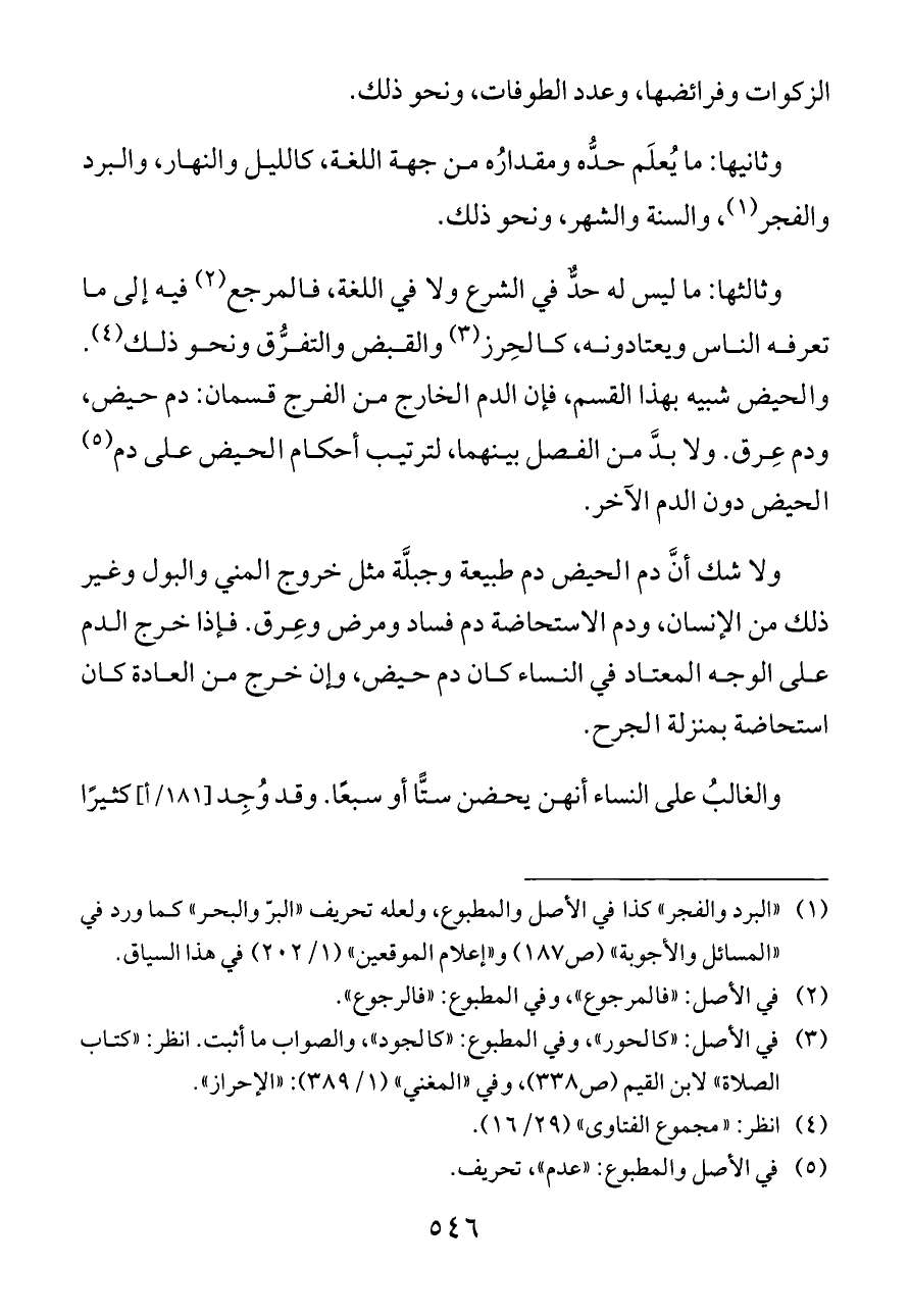 وثالثها: ما ليس له حدٌّ في الشرع ولا في اللغة، فالمرجع (¬٢) فيه إلى ما تعرفه الناس ويعتادونه، كالحِرز (¬٣) والقبض والتفرُّق ونحو ذلك (¬٤). والحيض شبيه بهذا القسم، فإن الدم الخارج من الفرج قسمان: دم حيض، ودم عِرق. ولا بدَّ من الفصل بينهما، لترتيب أحكام الحيض على دم (¬٥) الحيض دون الدم الآخر.