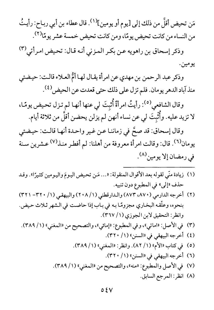 (¬١) زيادة منّي لقوله بعد الأقوال المنقولة: « ... مَن تحيض اليومَ واليومين كثيرًا». وقد حذف «إلى» في المطبوع دون تنبيه.