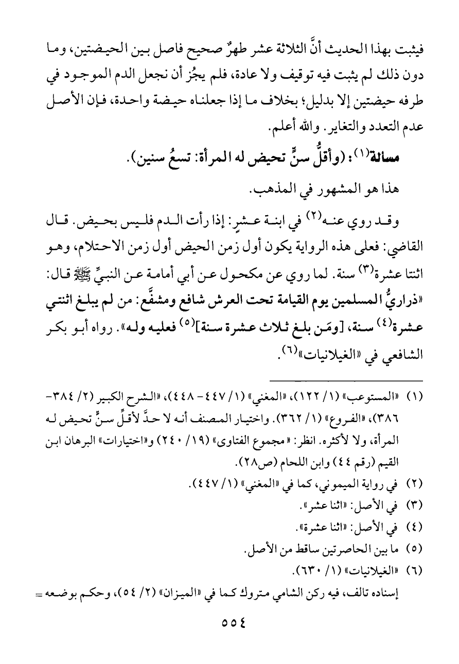 (¬١) «المستوعب» (١/ ١٢٢)، «المغني» (١/ ٤٤٧ - ٤٤٨)، «الشرح الكبير (٢/ ٣٨٤ - ٣٨٦)، «الفروع» (١/ ٣٦٢). واختيار المصنف أنه لا حدَّ لأقلِّ سنٍّ تحيض له المرأة، ولا لأكثره. انظر: «مجموع الفتاوى» (١٩/ ٢٤٠) و «اختيارات» البرهان ابن القيم (رقم ٤٤) وابن اللحام (ص ٢٨).