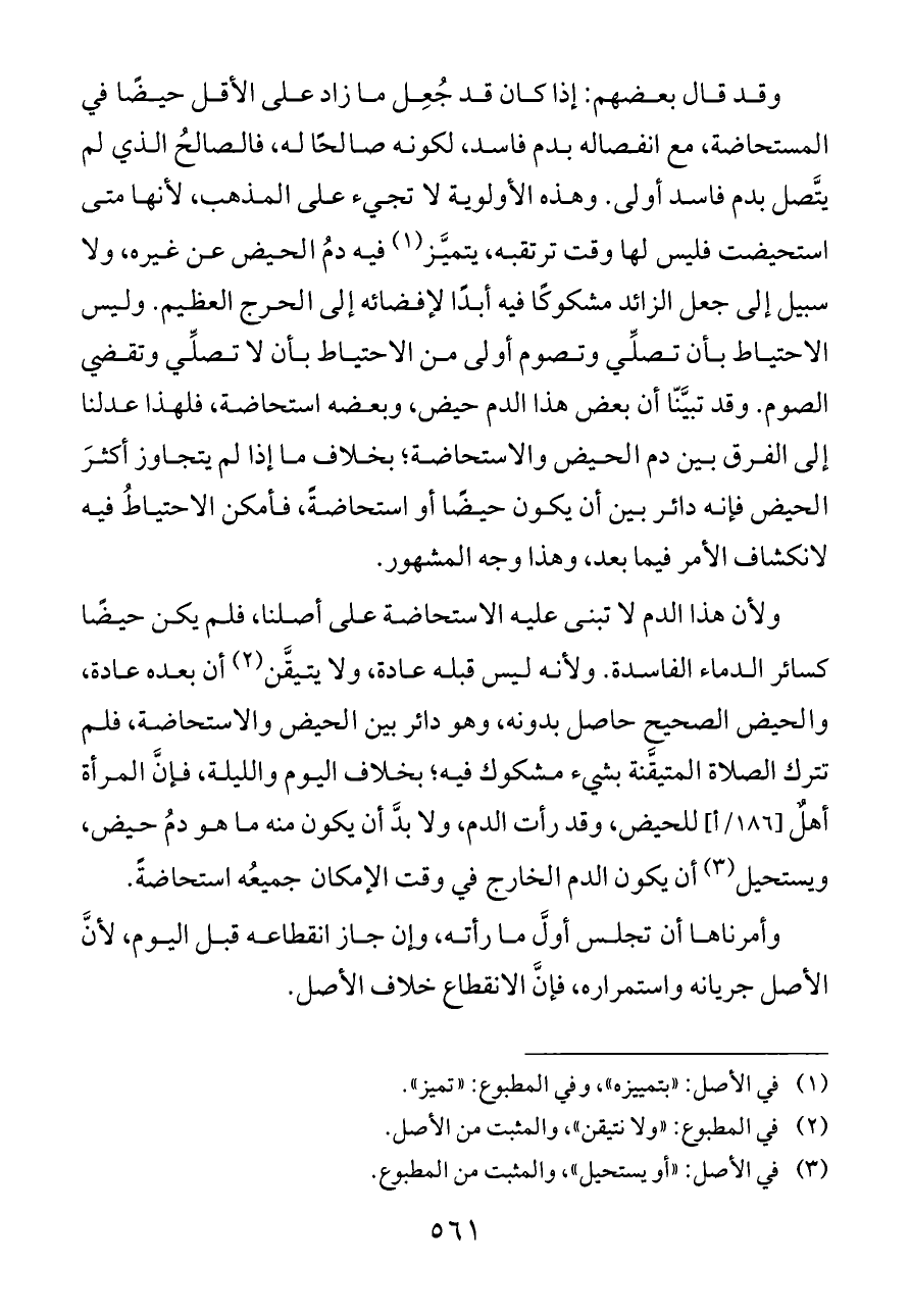 وقد قال بعضهم: إذا كان قد جُعِل ما زاد على الأقل حيضًا في المستحاضة، مع انفصاله بدم فاسد، لكونه صالحًا له، فالصالحُ الذي لم يتَّصل بدم فاسد أولى. وهذه الأولوية لا تجيء على المذهب، لأنها متى استحيضت فليس لها وقت ترتقبه، يتميَّز (¬١) فيه دمُ الحيض عن غيره، ولا سبيل إلى جعل الزائد مشكوكًا فيه أبدًا لإفضائه إلى الحرج العظيم. وليس الاحتياط بأن تصلِّي وتصوم أولى من الاحتياط بأن لا تصلِّي وتقضي الصوم. وقد تبيَّنّا أن بعض هذا الدم حيض، وبعضه استحاضة، فلهذا عدلنا إلى الفرق بين دم الحيض والاستحاضة؛ بخلاف ما إذا لم يتجاوز أكثرَ الحيض فإنه دائر بين أن يكون حيضًا أو استحاضةً، فأمكن الاحتياطُ فيه لانكشاف الأمر فيما بعد، وهذا وجه المشهور.