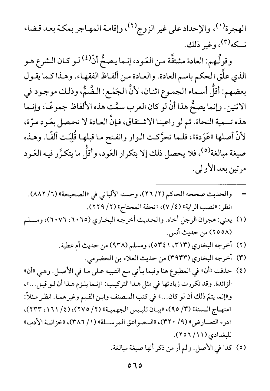 وقولُهم: العادة مشتقَّة من العَود، إنما يصحُّ أنْ (¬٤) لو كان الشرع هو الذي علَّق الحكم باسم العادة. والعادة من ألفاظ الفقهاء. وهذا كما يقول بعضهم: أقلُّ أسماء الجموع اثنان، لأنَّ الجَمْع: الضَّمُّ، وذلك موجود في الاثنين. وإنما يصحُّ هذا أنْ لو كان العرب سمَّت هذه الألفاظ جموعًا، وإنما هذه تسمية النحاة. ثم لو راعينا الاشتقاق، فإنَّ العادة لا تحصل بعَود مرّة، لأنّ أصلها «عَوَدة»، فلما تحرَّكت الواو وانفتح ما قبلها قُلِبَت ألفًا. وهذه صيغة مبالغة (¬٥)، فلا يحصل ذلك إلا بتكرار العَود، وأقلُّ ما يتكرَّر فيه العَود مرتين بعد الأولى.