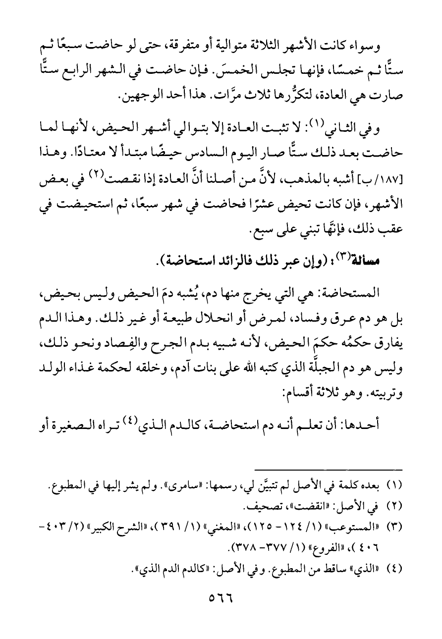 وفي الثاني (¬١): لا تثبت العادة إلا بتوالي أشهر الحيض، لأنها لما حاضت بعد ذلك ستًّا صار اليوم السادس حيضًا مبتدأ لا معتادًا. وهذا [١٨٧/ب] أشبه بالمذهب، لأنَّ من أصلنا أنَّ العادة إذا نقصت (¬٢) في بعض الأشهر، فإن كانت تحيض عشرًا فحاضت في شهر سبعًا، ثم استحيضت في عقب ذلك، فإنَّها تبني على سبع.