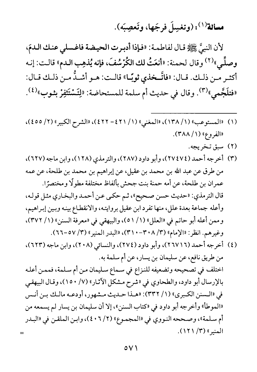 (¬٣) أخرجه أحمد (٢٧٤٧٤)، وأبو داود (٢٨٧)، والترمذي (١٢٨)، وابن ماجه (٦٢٧)، من طرق عن عبد الله بن محمد بن عقيل، عن إبراهيم بن محمد بن طلحة، عن عمه عمران بن طلحة، عن أمه حمنة بنت جحش بألفاظ مختلفة مطولًا ومختصرًا.