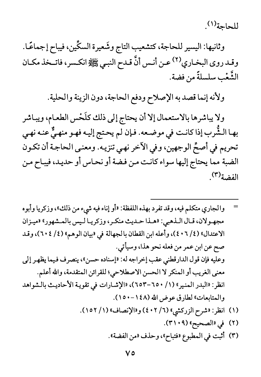 وثانيها: اليسير للحاجة، كتشعيب التاج وشَعيرة السكِّين، فيباح إجماعًا. وقد روى البخاري (¬٢) عن أنس أنَّ قدح النبي - صلى الله عليه وسلم - انكسر، فاتخذ مكان الشَّعْب سلسلةً من فضة.