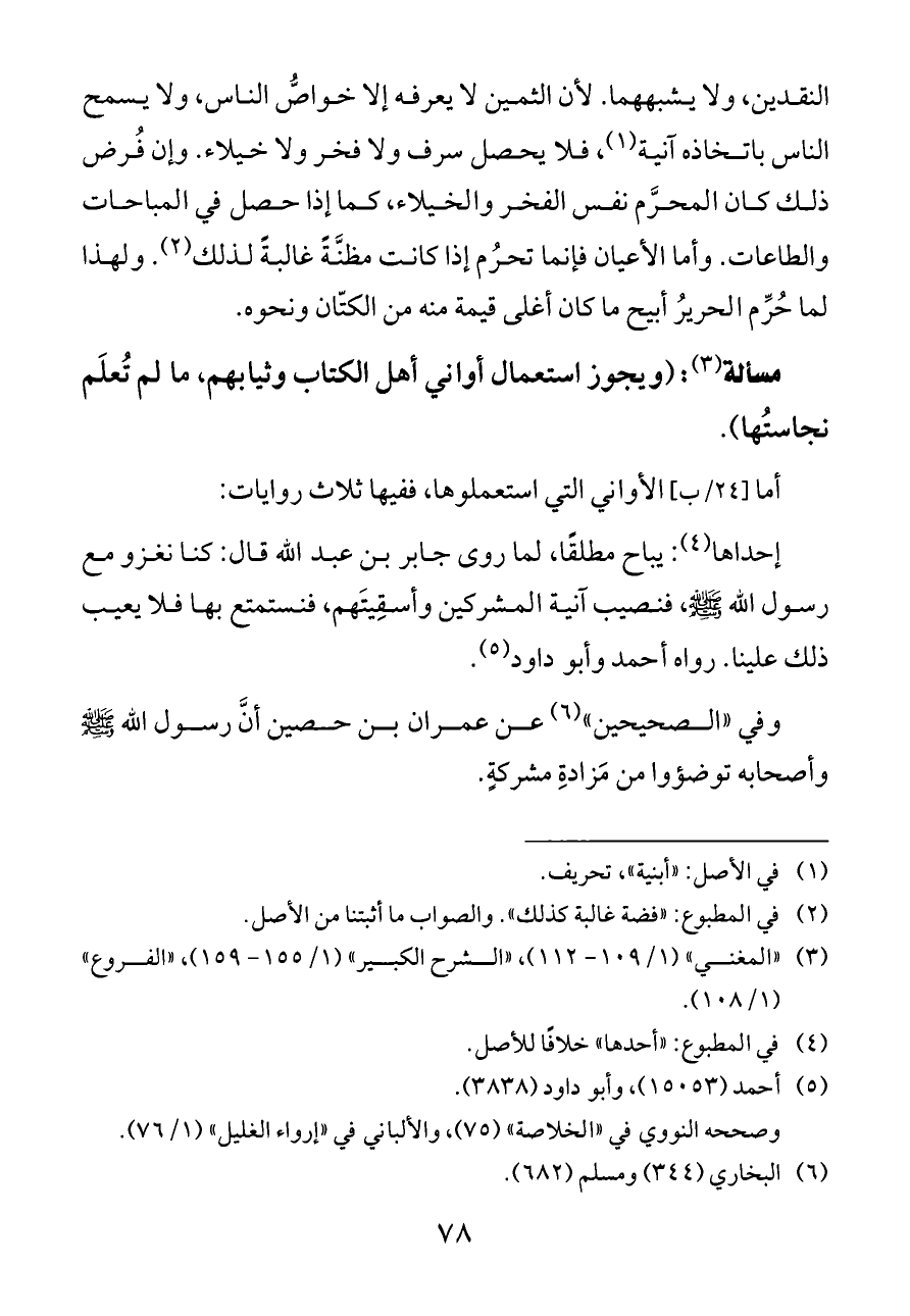 إحداها (¬٤): يباح مطلقًا، لما روى جابر بن عبد الله قال: كنا نغزو مع رسول الله - صلى الله عليه وسلم -، فنصيب آنية المشركين وأسقِيتَهم، فنستمتع بها فلا يعيب ذلك علينا. رواه أحمد وأبو داود (¬٥).