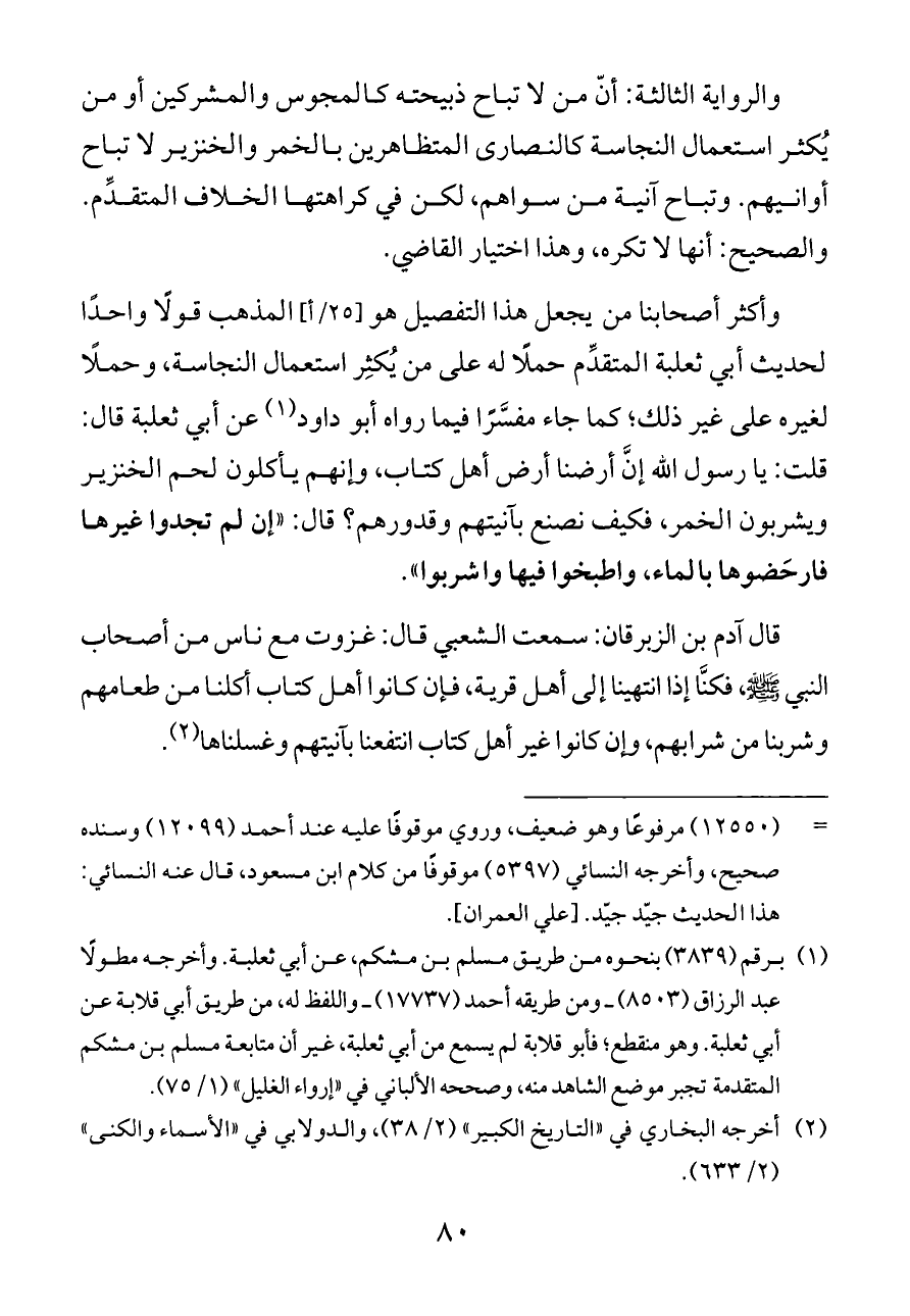 وأكثر أصحابنا من يجعل هذا التفصيل هو [٢٥/أ] المذهب قولًا واحدًا لحديث أبي ثعلبة المتقدِّم حملًا له على من يُكثِر استعمال النجاسة، وحملًا لغيره على غير ذلك؛ كما جاء مفسَّرًا فيما رواه أبو داود (¬١) عن أبي ثعلبة قال: قلت: يا رسول الله إنَّ أرضنا أرض أهل كتاب، وإنهم يأكلون لحم الخنزير ويشربون الخمر، فكيف نصنع بآنيتهم وقدورهم؟ قال: "إن لم تجدوا غيرها فارحَضوها بالماء، واطبخوا فيها واشربوا".
