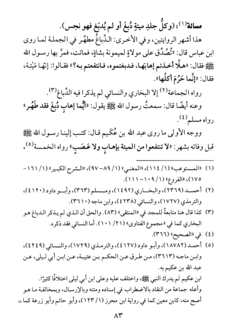 (¬٣) كذا قال هنا متابعةً للمجد في "المنتقى" (٨٣). والحق أن الذي لم يذكر الدباغ هو البخاري كما في "مجموع الفتاوى" (٢١/ ١٠١). أما النسائي فقد ذكره.