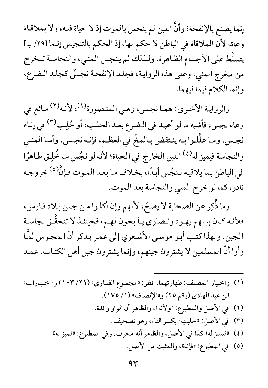 وما ذُكِر عن الصحابة لا يصحّ، لأنهم وإن أكلوا من جبن بلاد فارس، فلأنه كان بينهم يهود ونصارى يذبحون لهم، فحينئذ لا تتحقَّق نجاسة الجبن. ولهذا كتب أبو موسى الأشعري إلى عمر يذكر أنَ المجوس لمَّا رأوا أنّ المسلمين لا يشترون جبنهم، وإنما يشترون جبن أهل الكتاب، عمد