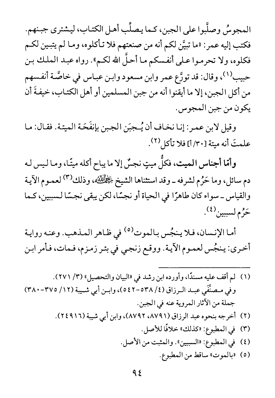المجوسُ وصلَّبوا على الجبن، كما يصلِّب أهل الكتاب، ليشترى جبنهم. فكتب إليه عمر: "ما تبيَّن لكم أنه من صنعتهم فلا تأكلوه، وما لم يتبين لكم فكلوه، ولا تحرموا على أنفسكم ما أحلَّ الله لكم". رواه عبد الملك بن حبيب (¬١)، وقال: قد تورَّع عمر وابن مسعود وابن عباس في خاصَّة أنفسهم من أكل الجبن، إلا ما أيقنوا أنه من جبن المسلمين أو أهل الكتاب، خيفةَ أن يكون من جبن المجوس.