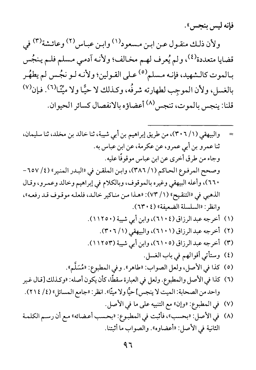 ولأن ذلك منقول عن ابن مسعود (¬١) وابن عباس (¬٢) وعائشة (¬٣) في قضايا متعددة (¬٤)، ولم يُعرف لهم مخالف؛ ولأنه آدمي مسلم فلم ينجُس بالموت كالشهيد، فإنه مسلم (¬٥) على القولين؛ ولأنه لو نجُس لم يطهُر بالغسل، ولأن الموجِب لطهارته شرفُه، وكذلك لا حيًّا ولا ميِّتًا (¬٦). فإن (¬٧) قلنا: ينجس بالموت، تنجس (¬٨) أعضاؤه بالانفصال كسائر الحيوان.
