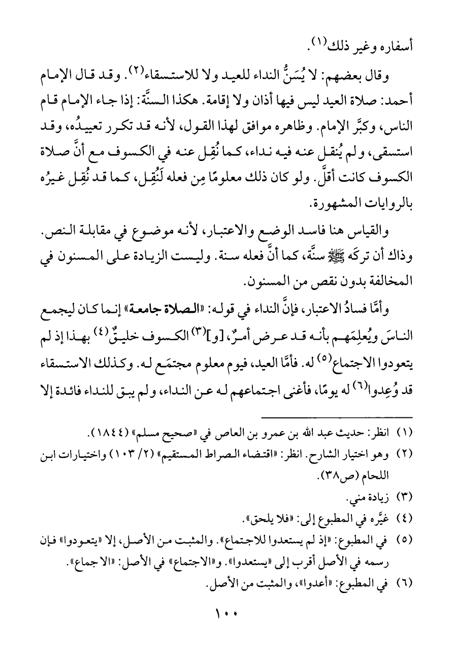وأمَّا فسادُ الاعتبار، فإنَّ النداء في قوله: «الصلاة جامعة» إنما كان ليجمع الناسَ ويُعلِمَهم بأنه قد عرض أمرٌ، [و] (¬٣) الكسوف خليقٌ (¬٤) بهذا إذ لم يتعودوا الاجتماع (¬٥) له. فأمَّا العيد، فيوم معلوم مجتمَع له. وكذلك الاستسقاء قد وُعِدوا (¬٦) له يومًا، فأغنى اجتماعهم له عن النداء، ولم يبق للنداء فائدة إلا
