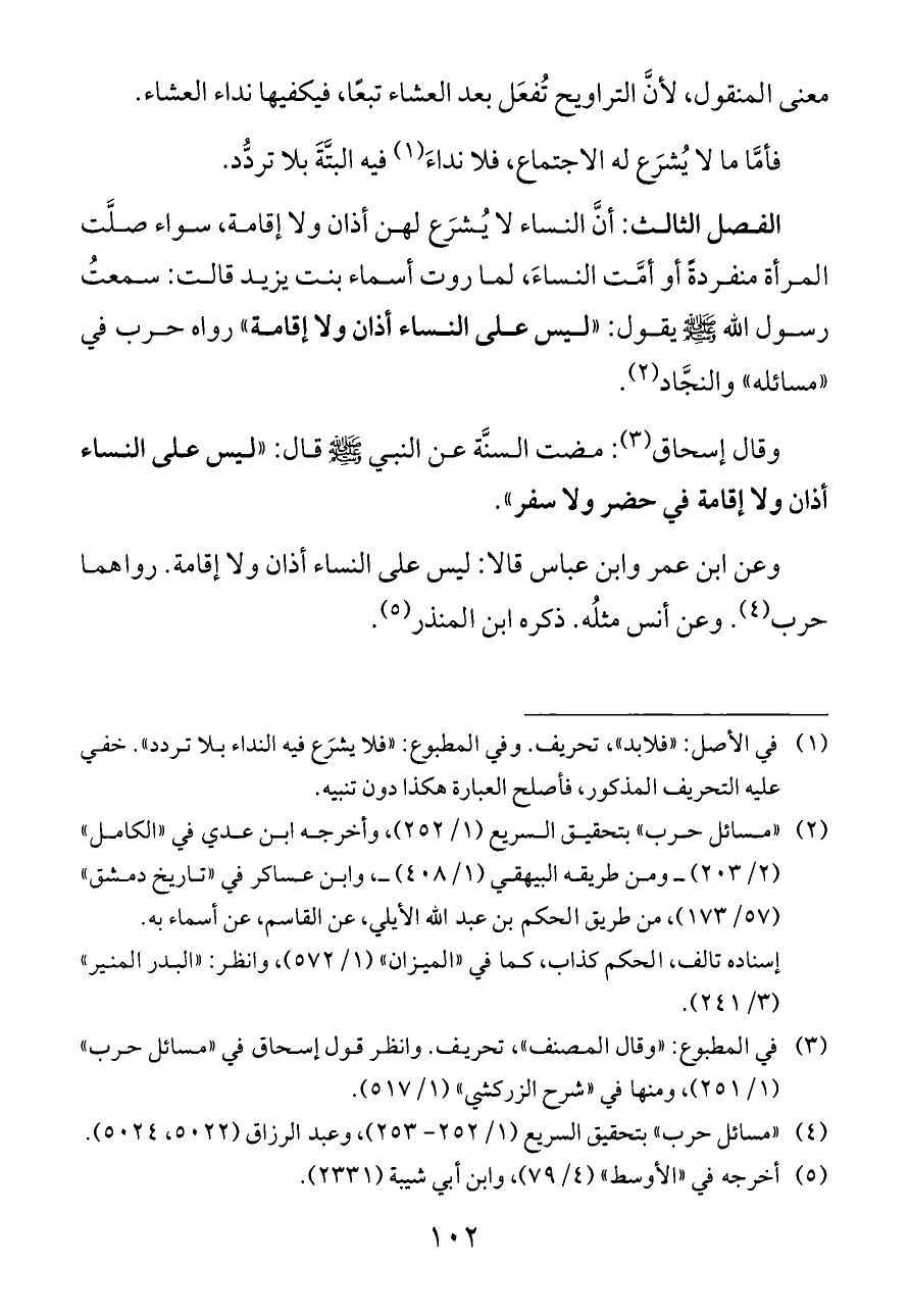 الفصل الثالث: أنَّ النساء لا يُشرَع لهن أذان ولا إقامة، سواء صلَّت المرأة منفردةً أو أمَّت النساءَ، لما روت أسماء بنت يزيد قالت: سمعتُ رسول الله - صلى الله عليه وسلم - يقول: «ليس على النساء أذان ولا إقامة» رواه حرب في «مسائله» والنجَّاد (¬٢).