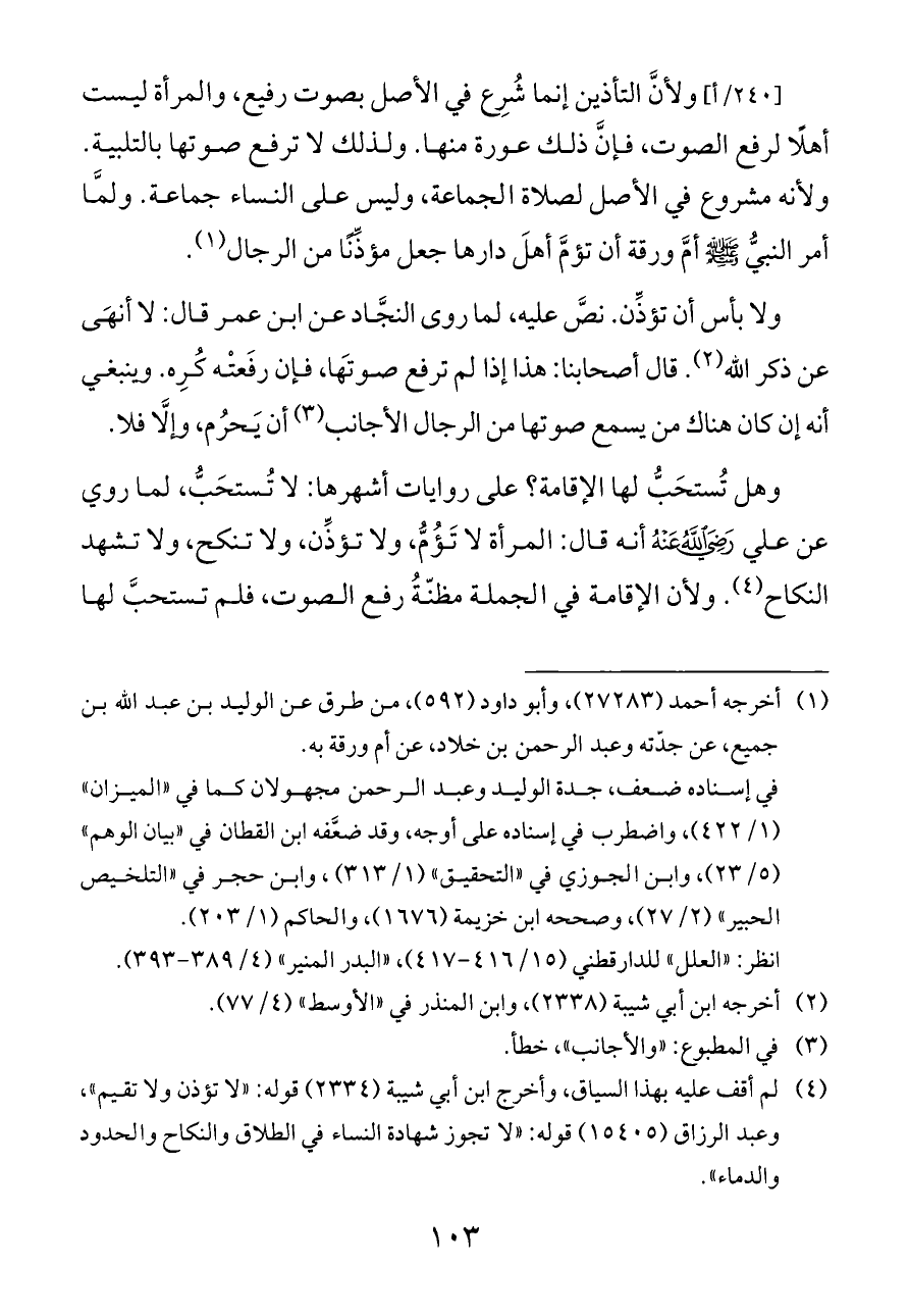 [٢٤٠/أ] ولأنَّ التأذين إنما شُرِع في الأصل بصوت رفيع، والمرأة ليست أهلًا لرفع الصوت، فإنَّ ذلك عورة منها. ولذلك لا ترفع صوتها بالتلبية. ولأنه مشروع في الأصل لصلاة الجماعة، وليس على النساء جماعة. ولمَّا أمر النبيُّ - صلى الله عليه وسلم - أمَّ ورقة أن تؤمَّ أهلَ دارها جعل مؤذِّنًا من الرجال (¬١).