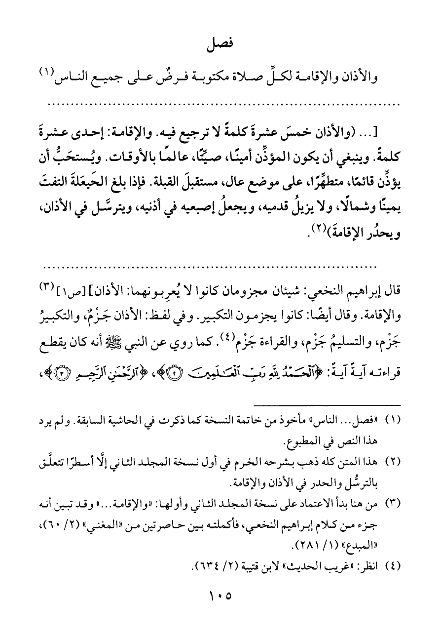 (¬٢) هذا المتن كله ذهب بشرحه الخرم في أول نسخة المجلد الثاني إلَّا أسطرًا تتعلَّق بالترسُّل والحدر في الأذان والإقامة.