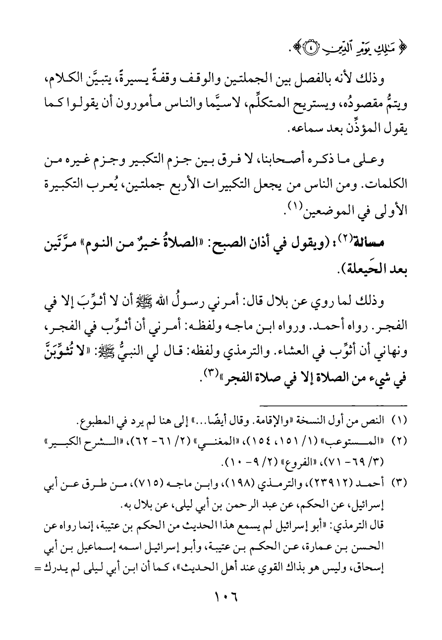 (¬٣) أحمد (٢٣٩١٢)، والترمذي (١٩٨)، وابن ماجه (٧١٥)، من طرق عن أبي إسرائيل، عن الحكم، عن عبد الرحمن بن أبي ليلى، عن بلال به.