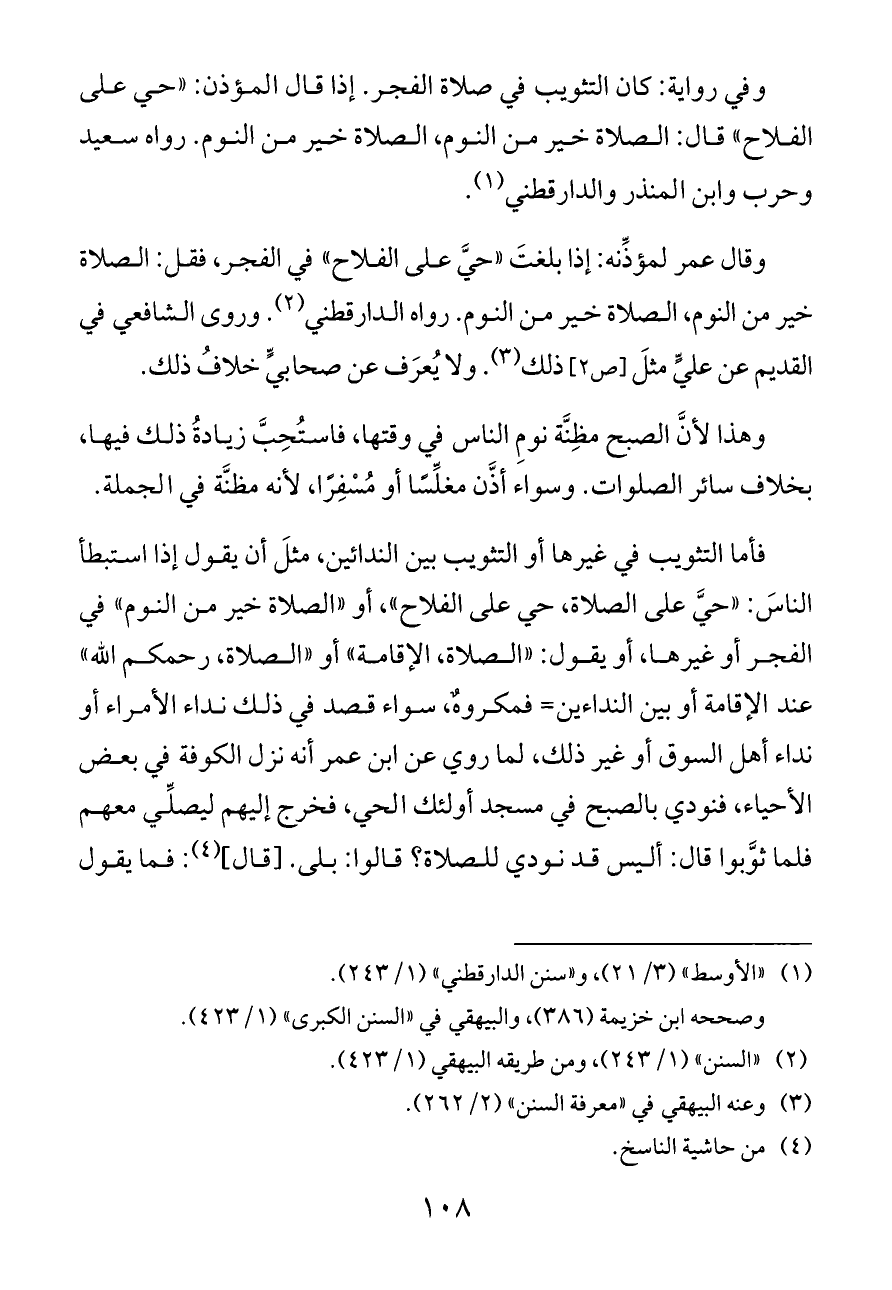 وقال عمر لمؤذِّنه: إذا بلغتَ «حيَّ على الفلاح» في الفجر، فقل: الصلاة خير من النوم، الصلاة خير من النوم. رواه الدارقطني (¬٢). وروى الشافعي في القديم عن عليٍّ مثلَ [ص ٢] ذلك (¬٣). ولا يُعرَف عن صحابيٍّ خلافُ ذلك.
