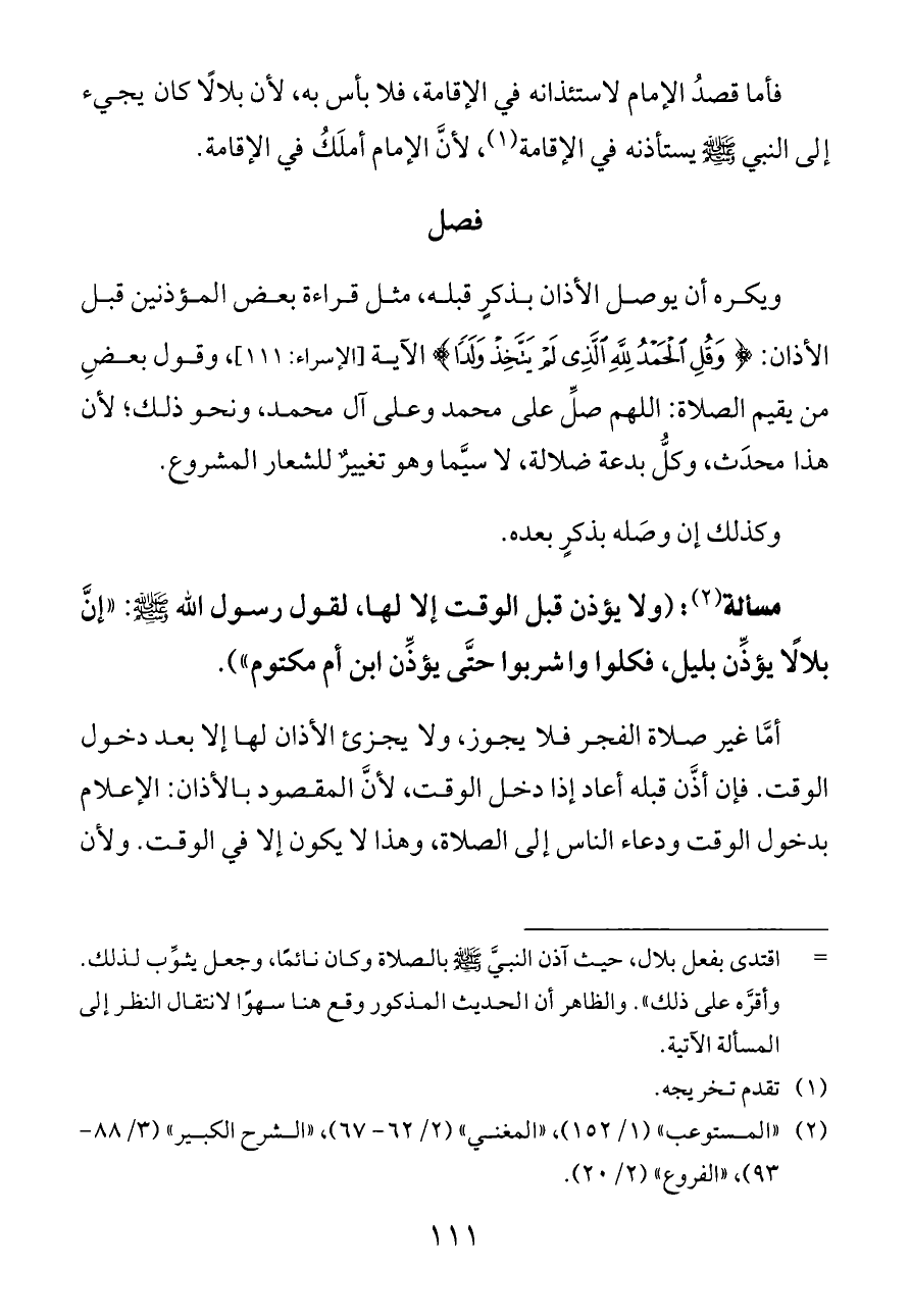 مسألة (¬٢): (ولا يؤذن قبل الوقت إلا لها، لقول رسول الله - صلى الله عليه وسلم -: «إنَّ بلالًا يؤذِّن بليل، فكلوا واشربوا حتَّى يؤذِّن ابن أم مكتوم»).
