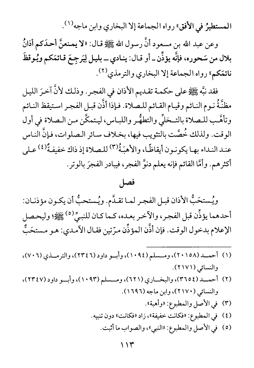 وعن عبد الله بن مسعود أنَّ رسول الله - صلى الله عليه وسلم - قال: «لا يمنعنَّ أحدَكم أذانُ بلال من سَحوره، فإنَّه يؤذِّن ــ أو قال: ينادي ــ بليل لِيَرجِعَ قائمَكم ويُوقظَ نائمَكم» رواه الجماعة إلا البخاري والترمذي (¬٢).