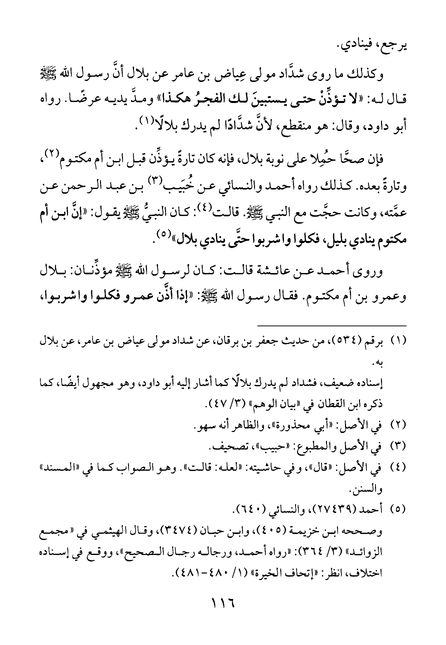 فإن صحَّا حُمِلا على نوبة بلال، فإنه كان تارةً يؤذِّن قبل ابن أم مكتوم (¬٢)، وتارةً بعده. كذلك رواه أحمد والنسائي عن خُبَيب (¬٣) بن عبد الرحمن عن عمَّته، وكانت حجَّت مع النبي - صلى الله عليه وسلم -. قالت (¬٤): كان النبيُّ - صلى الله عليه وسلم - يقول: «إنَّ ابن أم مكتوم ينادي بليل، فكلوا واشربوا حتَّى ينادي بلال» (¬٥).