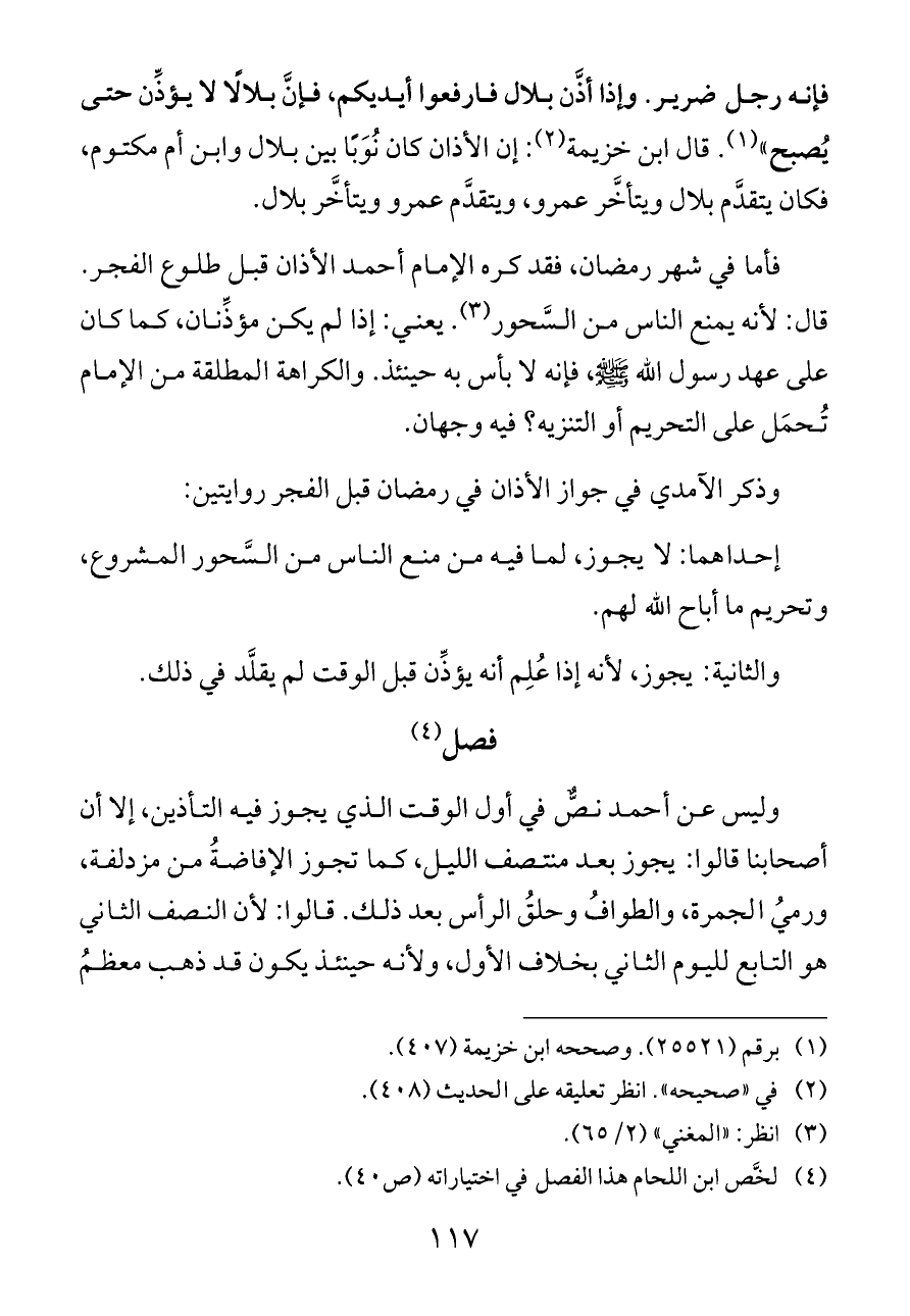 فأما في شهر رمضان، فقد كره الإمام أحمد الأذان قبل طلوع الفجر. قال: لأنه يمنع الناس من السَّحور (¬٣). يعني: إذا لم يكن مؤذِّنان، كما كان على عهد رسول الله - صلى الله عليه وسلم -، فإنه لا بأس به حينئذ. والكراهة المطلقة من الإمام تُحمَل على التحريم أو التنزيه؟ فيه وجهان.