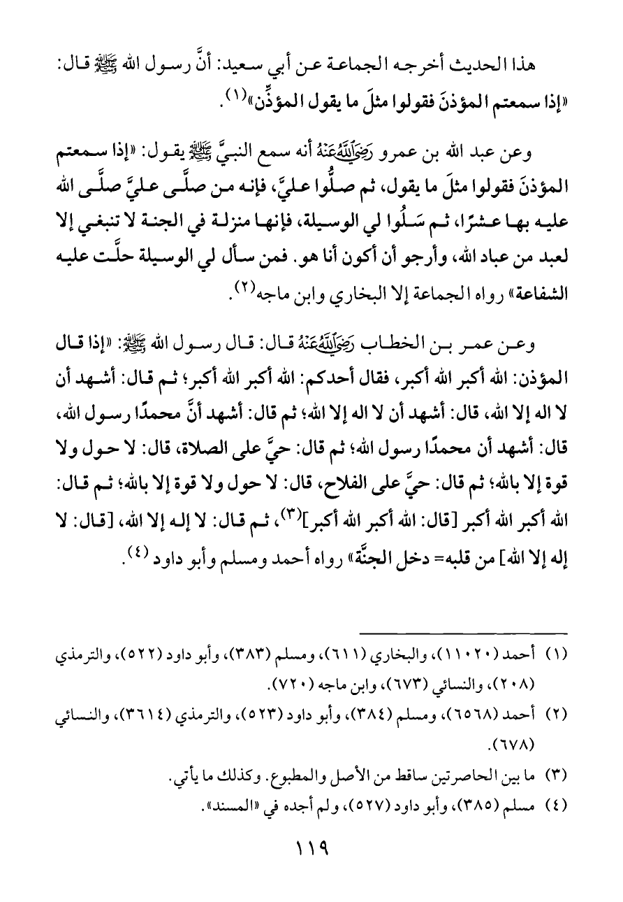 وعن عمر بن الخطاب - رضي الله عنه - قال: قال رسول الله - صلى الله عليه وسلم -: «إذا قال المؤذن: الله أكبر الله أكبر، فقال أحدكم: الله أكبر الله أكبر؛ ثم قال: أشهد أن لا اله إلا الله، قال: أشهد أن لا اله إلا الله؛ ثم قال: أشهد أنَّ محمدًا رسول الله، قال: أشهد أن محمدًا رسول الله؛ ثم قال: حيَّ على الصلاة، قال: لا حول ولا قوة إلا بالله؛ ثم قال: حيَّ على الفلاح، قال: لا حول ولا قوة إلا بالله؛ ثم قال: الله أكبر الله أكبر [قال: الله أكبر الله أكبر] (¬٣)، ثم قال: لا إله إلا الله، [قال: لا إله إلا الله] من قلبه= دخل الجنَّة» رواه أحمد ومسلم وأبو داود (¬٤).