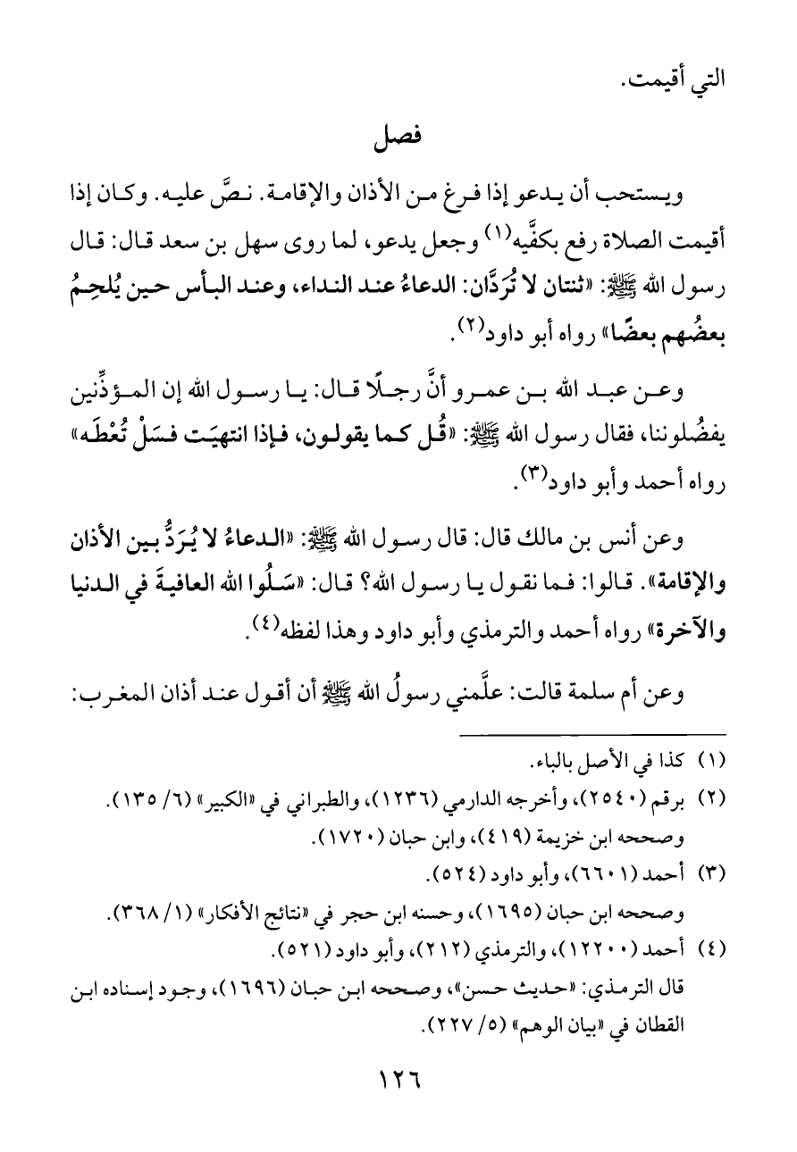 وعن أنس بن مالك قال: قال رسول الله - صلى الله عليه وسلم -: «الدعاءُ لا يُرَدُّ بين الأذان والإقامة». قالوا: فما نقول يا رسول الله؟ قال: «سَلُوا الله العافيةَ في الدنيا والآخرة» رواه أحمد والترمذي وأبو داود وهذا لفظه (¬٤).