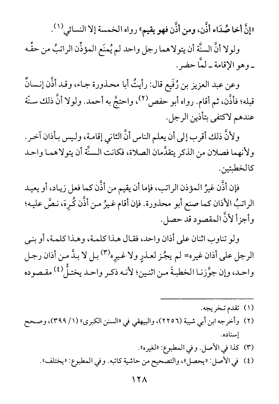 ولولا أنَّ السنَّة أن يتولاهما رجل واحد لم يُمنَع المؤذِّن الراتبُ من حقِّه ــ وهو الإقامة ــ لمَّا حضر.