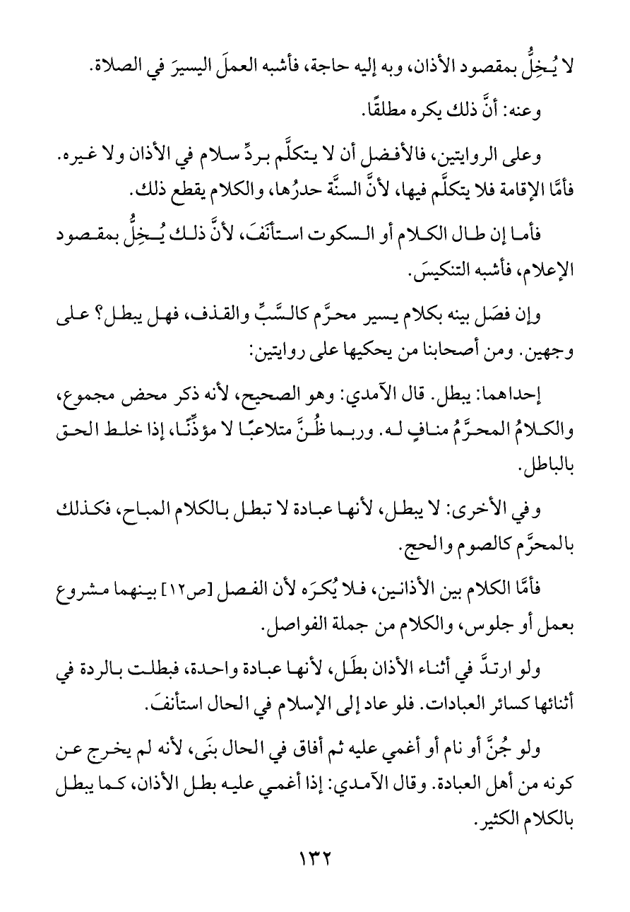 فأمَّا الكلام بين الأذانين، فلا يُكرَه لأن الفصل [ص ١٢] بينهما مشروع بعمل أو جلوس، والكلام من جملة الفواصل.