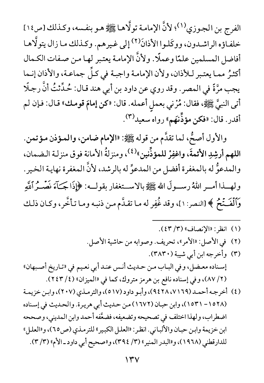 الفرج بن الجوزي (¬١)؛ لأنَّ الإمامة تولَّاها - صلى الله عليه وسلم - هو بنفسه، وكذلك [ص ١٤] خلفاؤه الراشدون، ووكَلوا الأذانَ (¬٢) إلى غيرهم. وكذلك ما زال يتولَّاها أفاضل المسلمين علمًا وعملًا. ولأنَّ الإمامة يعتبر لها من صفات الكمال أكثرُ مما يعتبر للأذان، ولأن الإمامة واجبة في كلِّ جماعة، والأذان إنما يجب مرَّةً في المصر. وقد روي عن داود بن أبي هند قال: حُدِّثتُ أنَّ رجلًا أتى النبيَّ - صلى الله عليه وسلم -، فقال: مُرْني بعملٍ أعمله. قال: «كن إمامَ قومك» قال: فإن لم أقدر. قال: «فكن مؤذِّنَهم» رواه سعيد (¬٣).