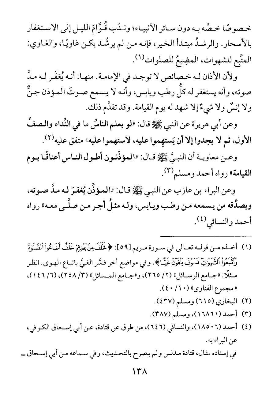 وعن معاوية أن النبيَّ - صلى الله عليه وسلم - قال: «المؤذّنون أطول الناس أعناقًا يوم القيامة» رواه أحمد ومسلم (¬٣).