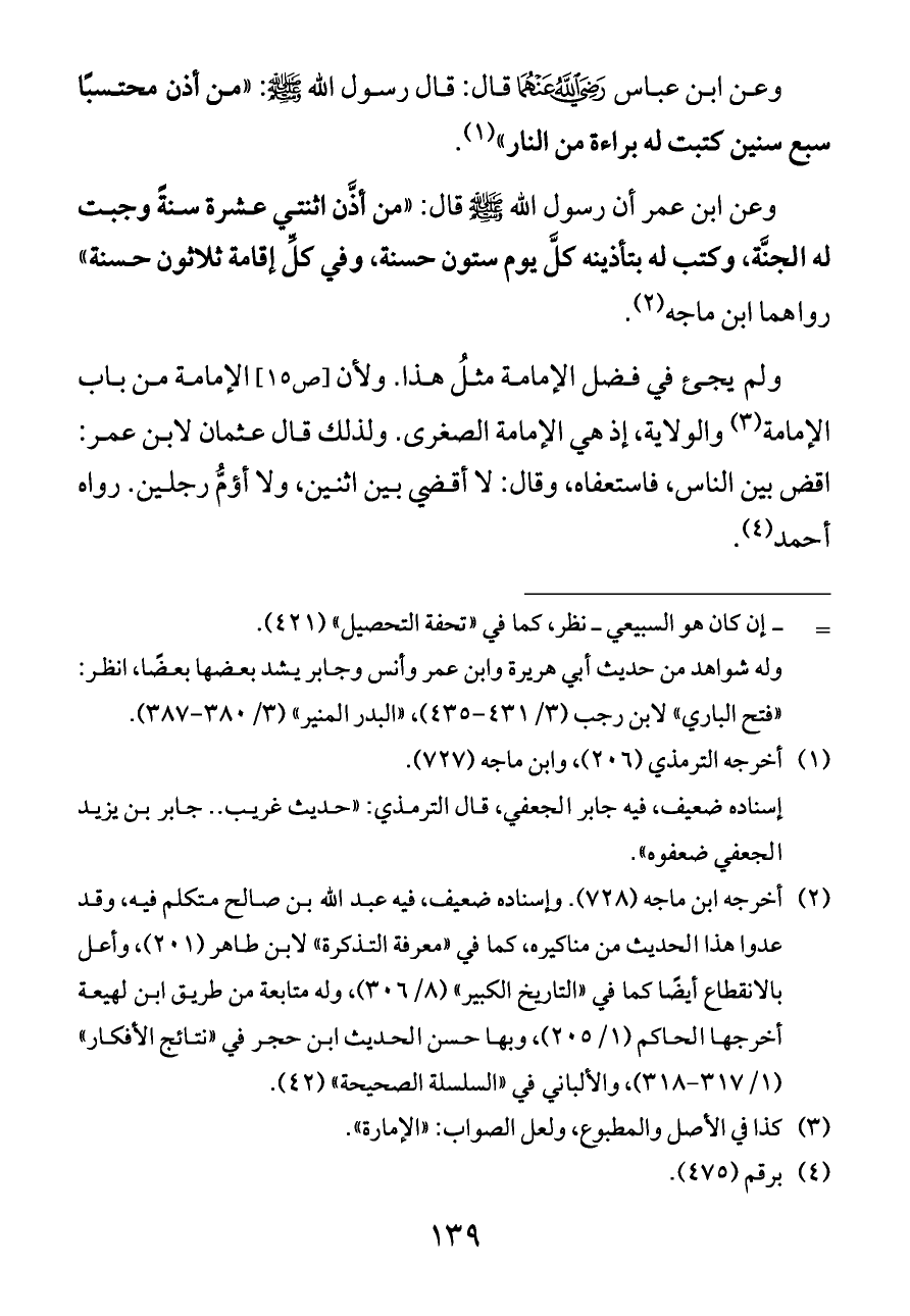 ولم يجئ في فضل الإمامة مثلُ هذا. ولأن [ص ١٥] الإمامة من باب الإمامة (¬٣) والولاية، إذ هي الإمامة الصغرى. ولذلك قال عثمان لابن عمر: اقض بين الناس، فاستعفاه، وقال: لا أقضي بين اثنين، ولا أؤمُّ رجلين. رواه أحمد (¬٤).