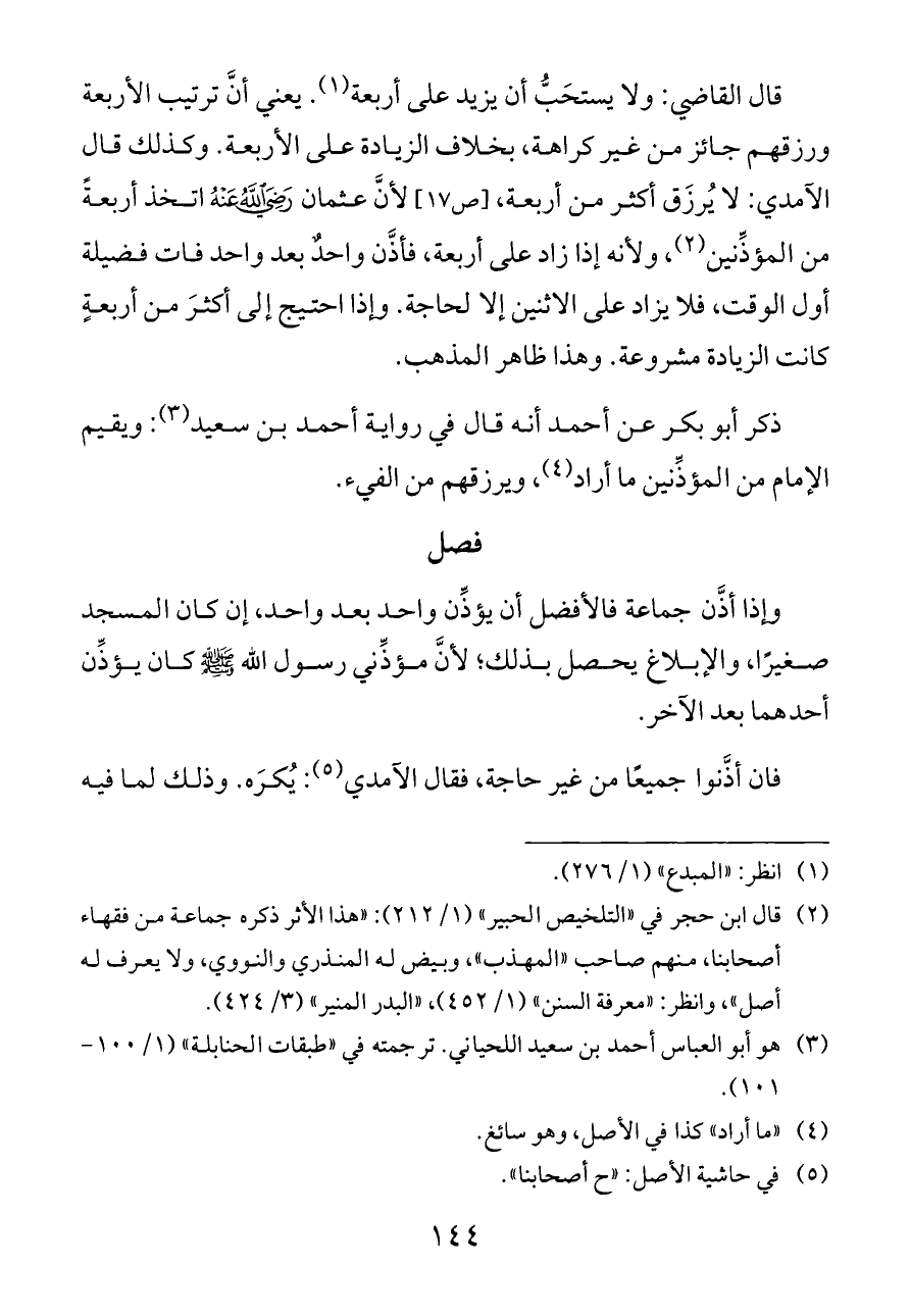 قال القاضي: ولا يستحَبُّ أن يزيد على أربعة (¬١). يعني أنَّ ترتيب الأربعة ورزقهم جائز من غير كراهة، بخلاف الزيادة على الأربعة. وكذلك قال الآمدي: لا يُرزَق أكثر من أربعة، [ص ١٧] لأنَّ عثمان - رضي الله عنه - اتخذ أربعةً من المؤذِّنين (¬٢)، ولأنه إذا زاد على أربعة، فأذَّن واحدٌ بعد واحد فات فضيلة أول الوقت، فلا يزاد على الاثنين إلا لحاجة. وإذا احتيج إلى أكثرَ من أربعةٍ كانت الزيادة مشروعة. وهذا ظاهر المذهب.