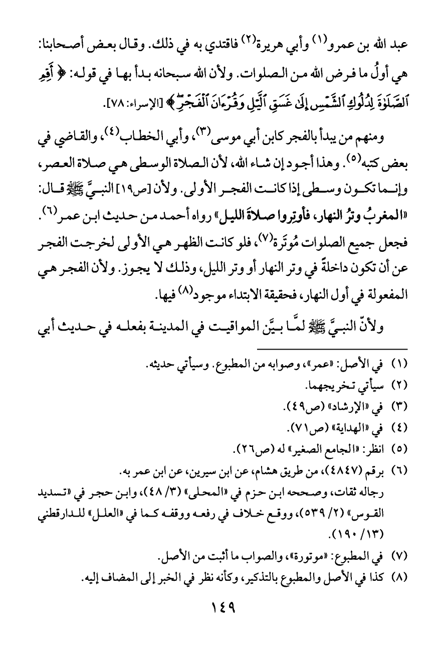 ومنهم من يبدأ بالفجر كابن أبي موسى (¬٣)، وأبي الخطاب (¬٤)، والقاضي في بعض كتبه (¬٥). وهذا أجود إن شاء الله، لأن الصلاة الوسطى هي صلاة العصر، وإنما تكون وسطى إذا كانت الفجر الأولى. ولأن [ص ١٩] النبيَّ - صلى الله عليه وسلم - قال: «المغربُ وترُ النهار، فأوتِروا صلاةَ الليل» رواه أحمد من حديث ابن عمر (¬٦). فجعل جميع الصلوات مُوتَرة (¬٧)، فلو كانت الظهر هي الأولى لخرجت الفجر عن أن تكون داخلةً في وتر النهار أو وتر الليل، وذلك لا يجوز. ولأن الفجر هي المفعولة في أول النهار، فحقيقة الابتداء موجود (¬٨) فيها.