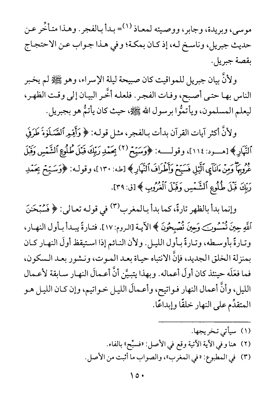 ولأنَّ أكثر آيات القرآن بدأت بالفجر، مثل قوله: {وَأَقِمِ الصَّلَاةَ طَرَفَيِ النَّهَارِ} [هود: ١١٤]، وقوله: {وَسَبِّحْ (¬٢) بِحَمْدِ رَبِّكَ قَبْلَ طُلُوعِ الشَّمْسِ وَقَبْلَ غُرُوبِهَا وَمِنْ آنَاءِ اللَّيْلِ فَسَبِّحْ وَأَطْرَافَ النَّهَارِ} [طه: ١٣٠]، وقوله: {وَسَبِّحْ بِحَمْدِ رَبِّكَ قَبْلَ طُلُوعِ الشَّمْسِ وَقَبْلَ الْغُرُوبِ} [ق: ٣٩].