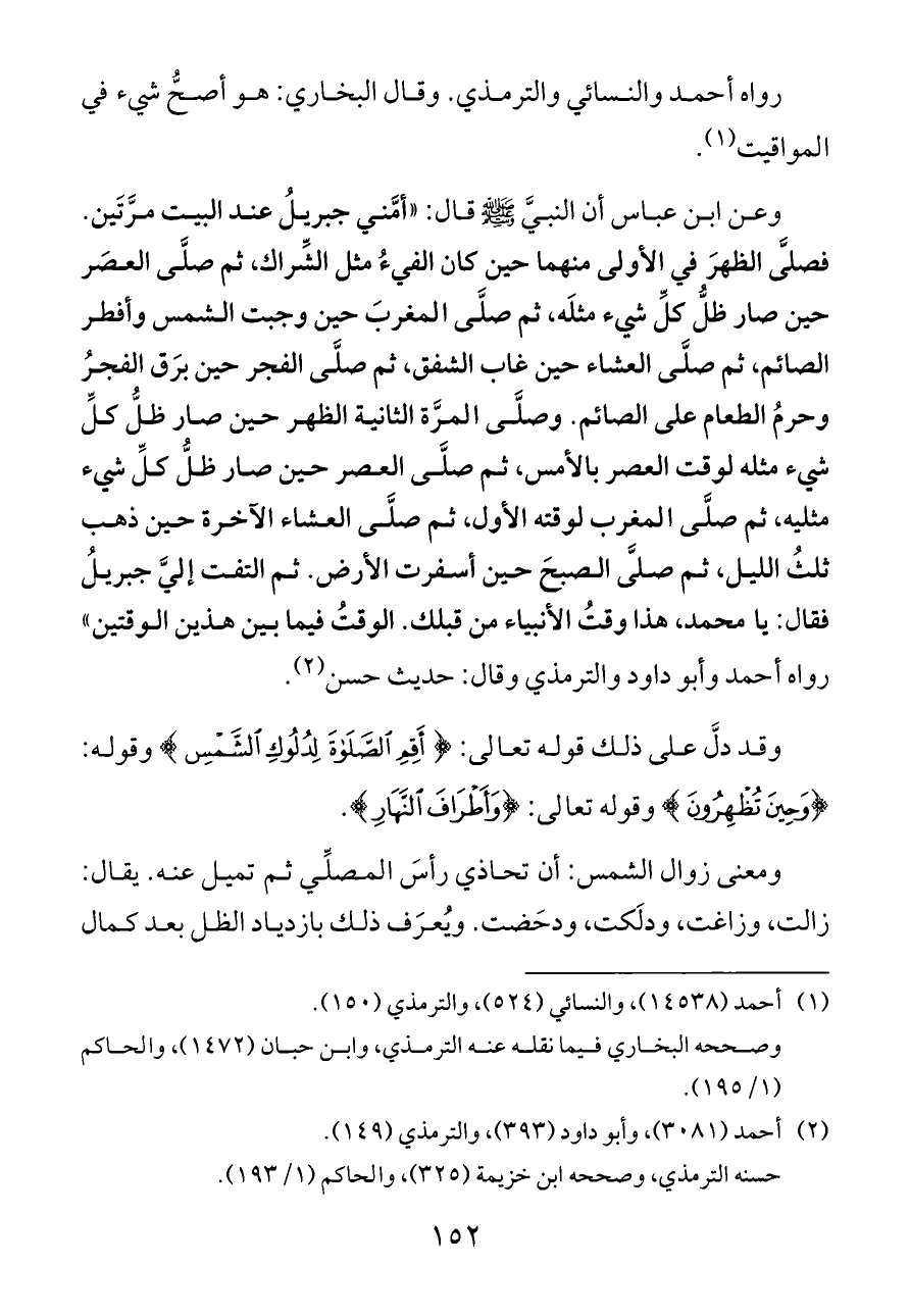 وعن ابن عباس أن النبيَّ - صلى الله عليه وسلم - قال: «أمَّني جبريلُ عند البيت مرَّتَين. فصلَّى الظهرَ في الأولى منهما حين كان الفيءُ مثل الشِّراك، ثم صلَّى العصَر حين صار ظلُّ كلِّ شيء مثلَه، ثم صلَّى المغربَ حين وجبت الشمس وأفطر الصائم، ثم صلَّى العشاء حين غاب الشفق، ثم صلَّى الفجر حين برَق الفجرُ وحرمُ الطعام على الصائم. وصلَّى المرَّة الثانية الظهر حين صار ظلُّ كلِّ شيء مثله لوقت العصر بالأمس، ثم صلَّى العصر حين صار ظلُّ كلِّ شيء مثليه، ثم صلَّى المغرب لوقته الأول، ثم صلَّى العشاء الآخرة حين ذهب ثلثُ الليل، ثم صلَّى الصبحَ حين أسفرت الأرض. ثم التفت إليَّ جبريلُ فقال: يا محمد, هذا وقتُ الأنبياء من قبلك. الوقتُ فيما بين هذين الوقتين» رواه أحمد وأبو داود والترمذي وقال: حديث حسن (¬٢).