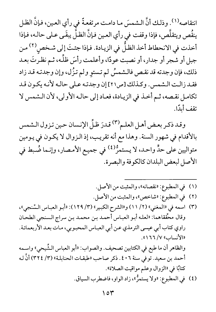 انتقاصه (¬١). وذلك أنَّ الشمسَ ما دامت مرتفعةً في رأي العين، فإنَّ الظل ينقُص ويتقلَّص، فإذا وقفت في رأي العين فإنَّ الظلَّ يبقَى على حاله، فإذا أخذت في الانحطاط أخذ الظلُّ في الزيادة. فإذا جئتَ إلى شخصٍ (¬٢) من جبل أو شجر أو جدار، أو نصبت عودًا، وأعلمت رأسَ ظلِّه، ثم نظرتَ بعد ذلك، فإن وجدته قد نقص فالشمسُ لم تستوِ ولم تزُل، وإن وجدته قد زاد فقد زالت الشمس. وكذلك [ص ٢١] إن وجدته على حاله لأنه يكون قد تكامل نقصه، ثم أخذ في الزيادة، فعاد إلى حاله الأولى، لأن الشمس لا تقف أبدًا.