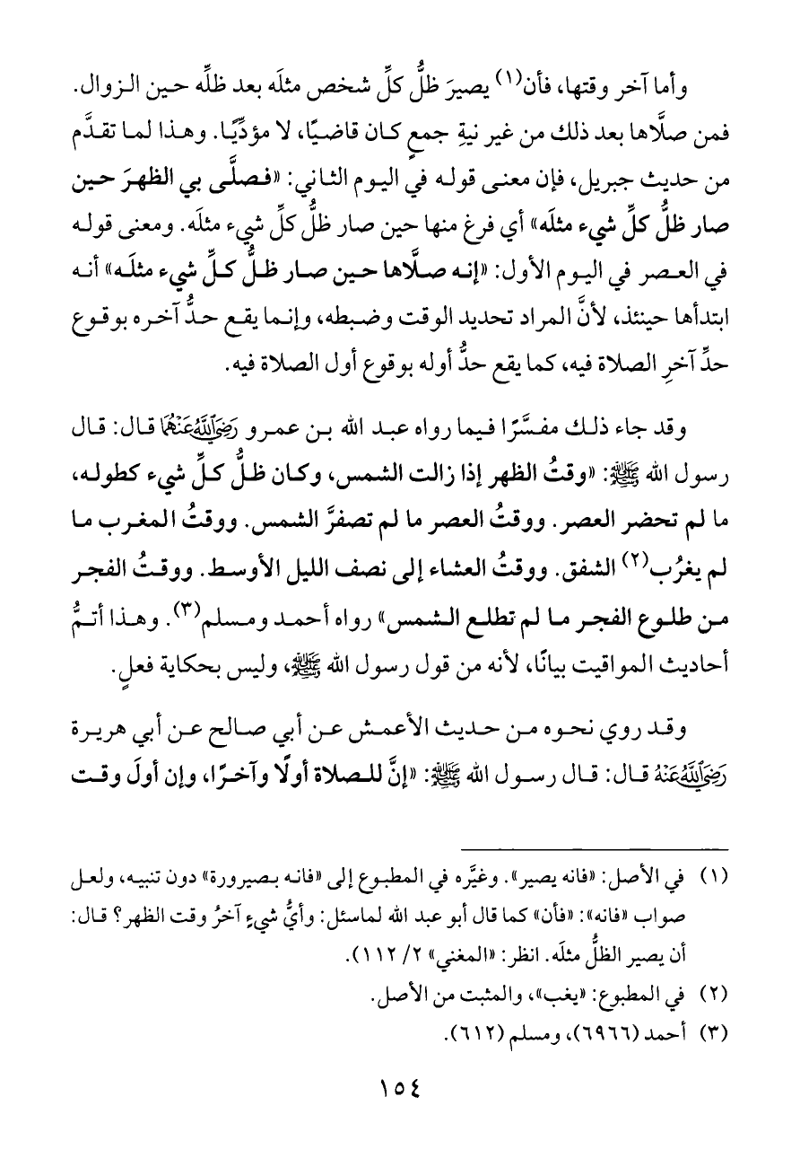(¬١) في الأصل: «فانه يصير». وغيَّره في المطبوع إلى «فانه بصيرورة» دون تنبيه، ولعل صواب «فانه»: «فأن» كما قال أبو عبد الله لماسئل: وأيُّ شيءٍ آخرُ وقت الظهر؟ قال: أن يصير الظلُّ مثلَه. انظر: «المغني» ٢/ ١١٢).
