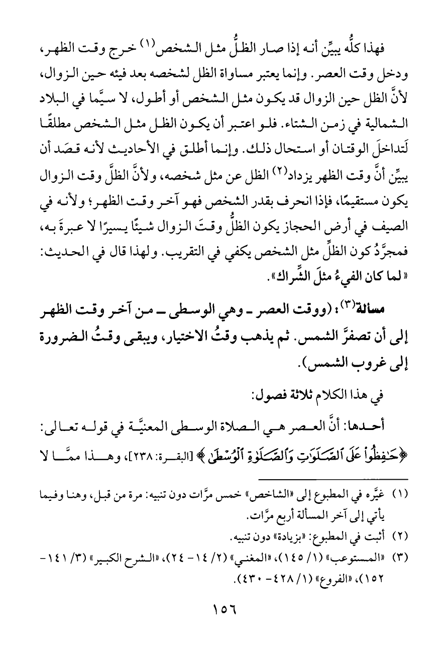 فهذا كلُّه يبيِّن أنه إذا صار الظلُّ مثل الشخص (¬١) خرج وقت الظهر، ودخل وقت العصر. وإنما يعتبر مساواة الظل لشخصه بعد فيئه حين الزوال، لأنَّ الظل حين الزوال قد يكون مثل الشخص أو أطول، لا سيَّما في البلاد الشمالية في زمن الشتاء. فلو اعتبر أن يكون الظل مثل الشخص مطلقًا لَتداخلَ الوقتان أو استحال ذلك. وإنما أطلق في الأحاديث لأنه قصَد أن يبيِّن أنَّ وقت الظهر يزداد (¬٢) الظل عن مثل شخصه، ولأنَّ الظلَّ وقت الزوال يكون مستقيمًا، فإذا انحرف بقدر الشخص فهو آخر وقت الظهر؛ ولأنه في الصيف في أرض الحجاز يكون الظلُّ وقتَ الزوال شيئًا يسيرًا لا عبرةَ به، فمجرَّدُ كون الظلِّ مثل الشخص يكفي في التقريب. ولهذا قال في الحديث: «لما كان الفيءُ مثلَ الشِّراك».