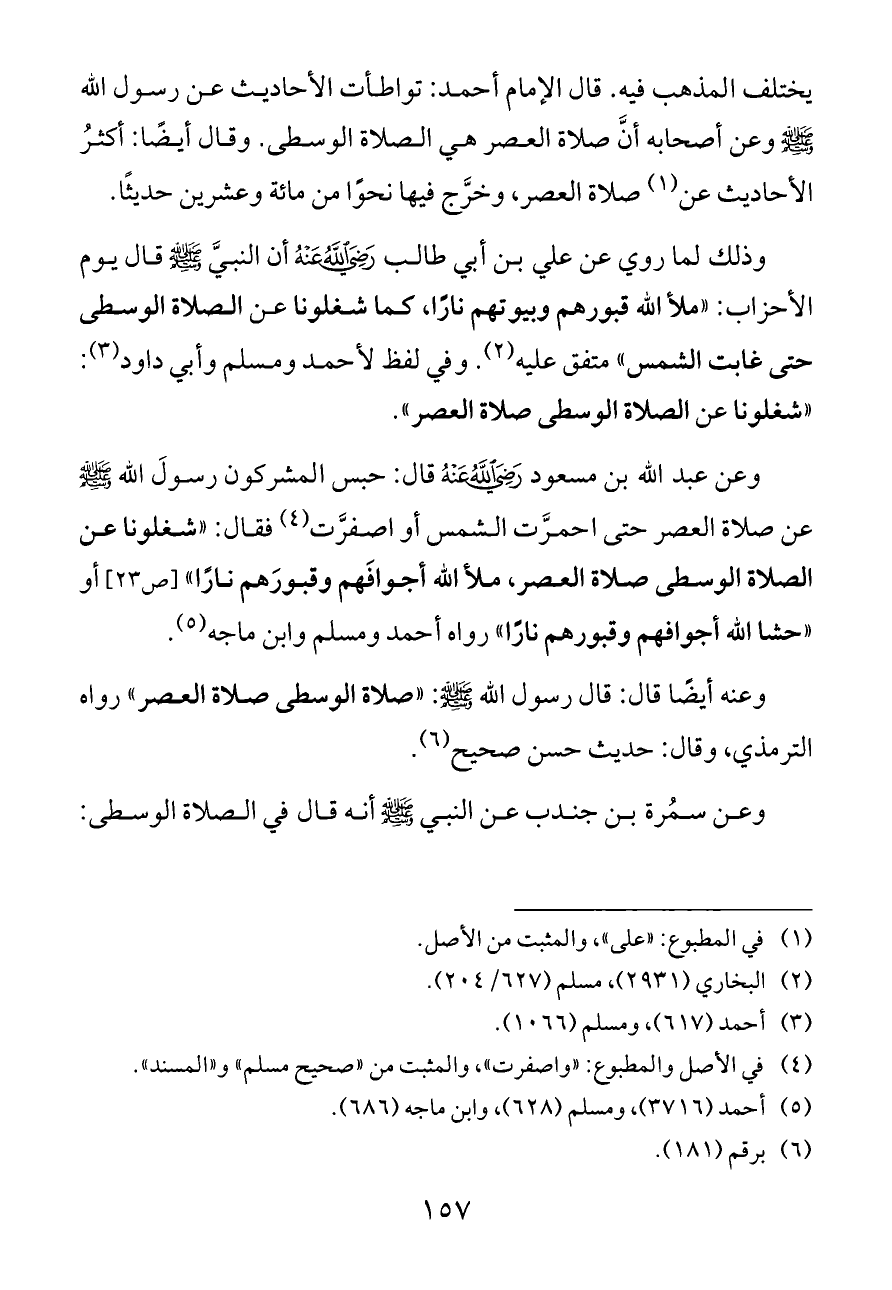 وذلك لما روي عن علي بن أبي طالب - رضي الله عنه - أن النبيَّ - صلى الله عليه وسلم - قال يوم الأحزاب: «ملأ الله قبورهم وبيوتهم نارًا، كما شغلونا عن الصلاة الوسطى حتى غابت الشمس» متفق عليه (¬٢). وفي لفظ لأحمد ومسلم وأبي داود (¬٣): «شغلونا عن الصلاة الوسطى صلاة العصر».
