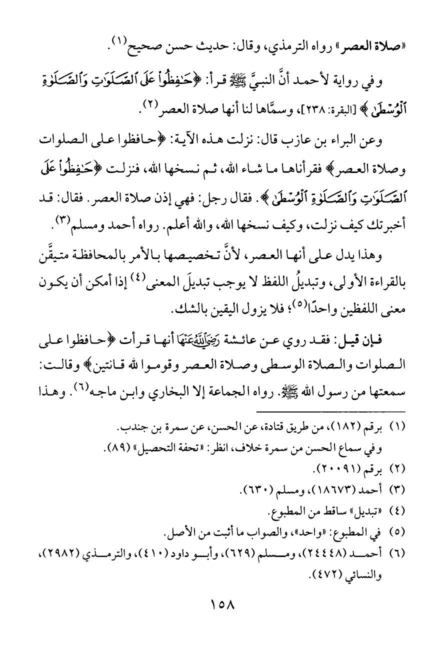 وعن البراء بن عازب قال: نزلت هذه الآية: {حافظوا على الصلوات وصلاة العصر} فقرأناها ما شاء الله، ثم نسخها الله، فنزلت {حَافِظُوا عَلَى الصَّلَوَاتِ وَالصَّلَاةِ الْوُسْطَى}. فقال رجل: فهي إذن صلاة العصر. فقال: قد أخبرتك كيف نزلت، وكيف نسخها الله، والله أعلم. رواه أحمد ومسلم (¬٣).