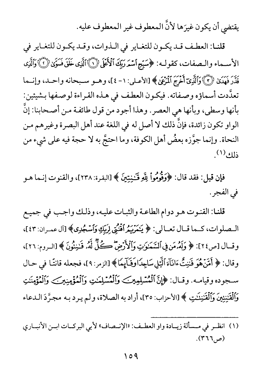 قلنا: العطف قد يكون للتغاير في الذوات، وقد يكون للتغاير في الأسماء والصفات، كقوله: {سَبِّحِ اسْمَ رَبِّكَ الْأَعْلَى (١) الَّذِي خَلَقَ فَسَوَّى (٢) وَالَّذِي قَدَّرَ فَهَدَى (٣) وَالَّذِي أَخْرَجَ الْمَرْعَى} [الأعلى: ١ - ٤]، وهو سبحانه واحد، وإنما تعدَّدت أسماؤه وصفاته. فيكون العطف في هذه القراءة لوصفها بشيئين: بأنها وسطى، وبأنها هي العصر. وهذا أجود من قول طائفة من أصحابنا: إنَّ الواو تكون زائدة، فإنَّ ذلك لا أصل له في اللغة عند أهل البصرة وغيرهم من النحاة. وإنما جوَّزه بعضُ أهل الكوفة، وما احتجَّ به لا حجة فيه على شيء من ذلك (¬١).