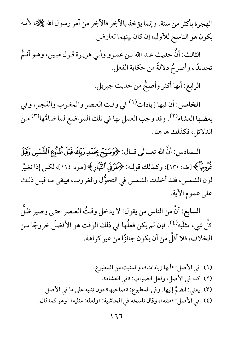 الخامس: أن فيها زيادات (¬١) في وقت العصر والمغرب والفجر، وفي بعضها العشاء (¬٢). وقد وجب العمل بها في تلك المواضع لما ضامَّها (¬٣) من الدلائل، فكذلك ها هنا.
