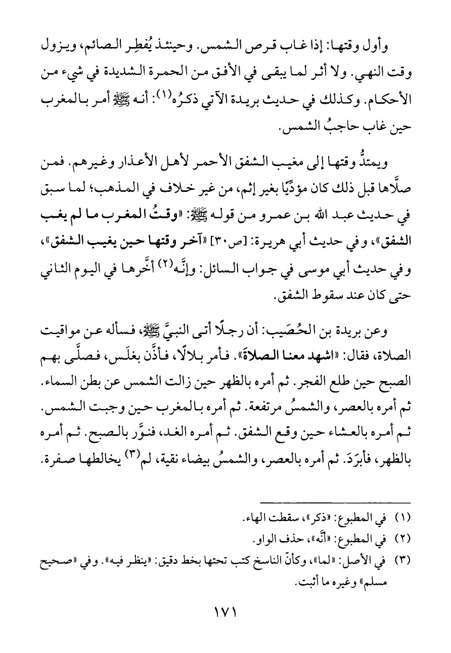 وأول وقتها: إذا غاب قرص الشمس. وحينئذ يُفطِر الصائم، ويزول وقت النهي. ولا أثر لما يبقى في الأفق من الحمرة الشديدة في شيء من الأحكام. وكذلك في حديث بريدة الآتي ذكرُه (¬١): أنه - صلى الله عليه وسلم - أمر بالمغرب حين غاب حاجبُ الشمس.