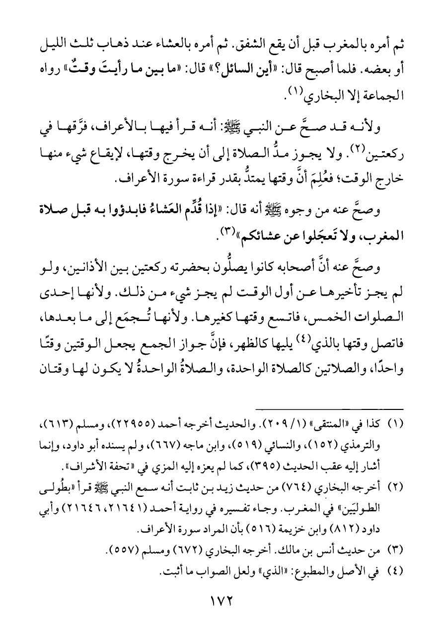 وصحَّ عنه أنَّ أصحابه كانوا يصلُّون بحضرته ركعتين بين الأذانين، ولو لم يجز تأخيرها عن أول الوقت لم يجز شيء من ذلك. ولأنها إحدى الصلوات الخمس، فاتسع وقتها كغيرها. ولأنها تُجمَع إلى ما بعدها، فاتصل وقتها بالذي (¬٤) يليها كالظهر، فإنَّ جواز الجمع يجعل الوقتين وقتًا واحدًا، والصلاتين كالصلاة الواحدة، والصلاةُ الواحدةُ لا يكون لها وقتان