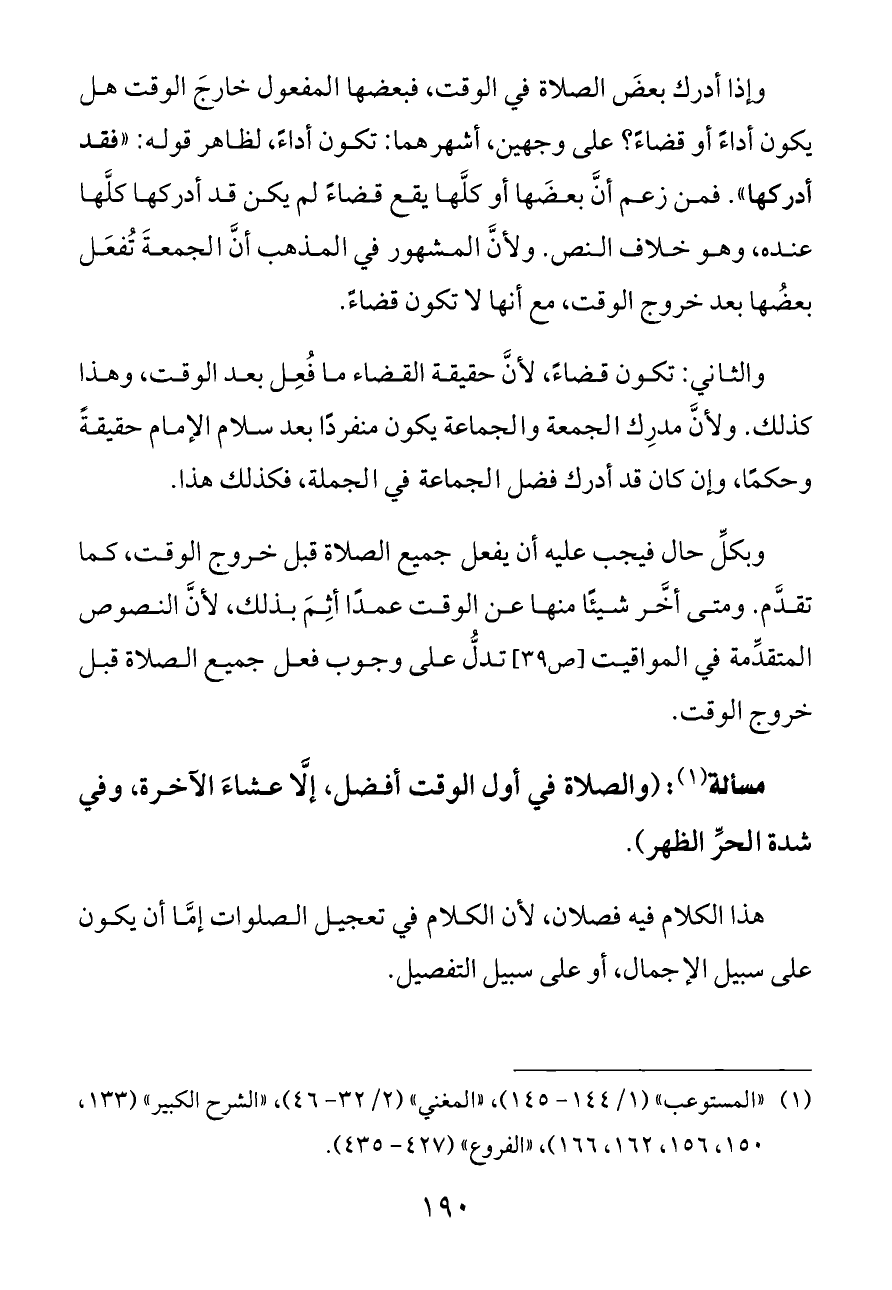 وبكلِّ حال فيجب عليه أن يفعل جميع الصلاة قبل خروج الوقت، كما تقدَّم. ومتى أخَّر شيئًا منها عن الوقت عمدًا أثِمَ بذلك، لأنَّ النصوص المتقدِّمة في المواقيت [ص ٣٩] تدلُّ على وجوب فعل جميع الصلاة قبل خروج الوقت.