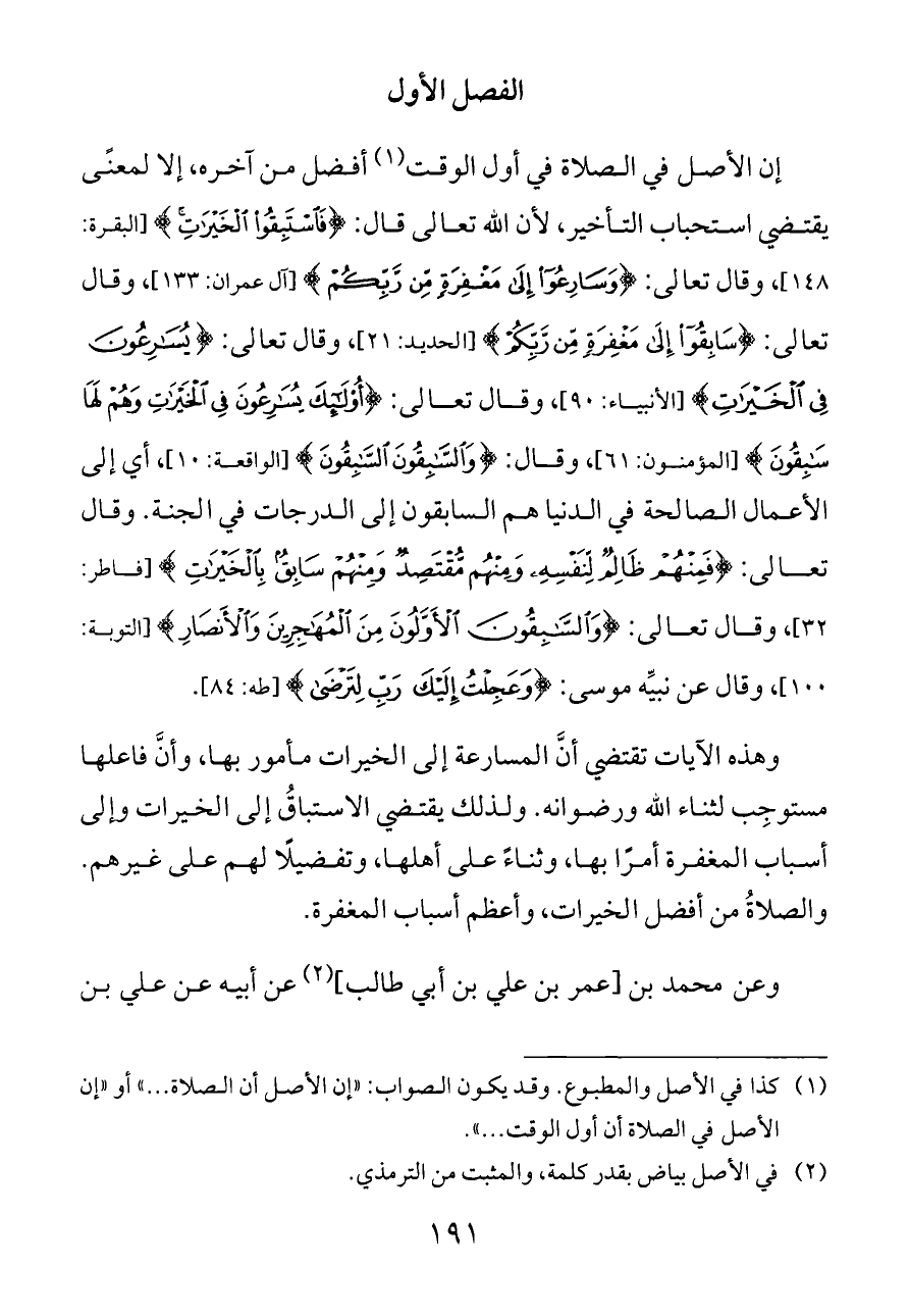 (¬١) كذا في الأصل والمطبوع. وقد يكون الصواب: «إن الأصل أن الصلاة ... » أو «إن الأصل في الصلاة أن أول الوقت ... ».