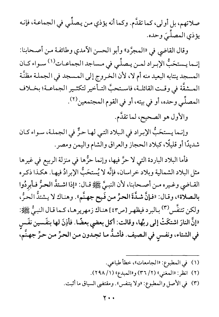 فأما البلاد الباردة التي لا حرَّ فيها، وإنما حرُّها في منزلة الربيع في غيرها مثل البلاد الشمالية وبلاد خراسان، فإنَّه لا يُستحَبُّ الإبرادُ فيها. هكذا ذكره القاضي وغيره من أصحابنا، لأن النبيَّ - صلى الله عليه وسلم - قال: «إذا اشتدَّ الحرُّ فأبرِدُوا بالصلاة»، وقال: «فإنَّ شدَّةَ الحرِّ من فَيح جهنَّم». وهناك لا يشتدُّ الحرُّ، ولكن تتنفَّس (¬٣) بالبرد فيظهر [ص ٤٣] هناك زمهريرها، كما قال النبيُّ - صلى الله عليه وسلم -: «إنَّ النارَ اشتكَتْ إلى ربِّها، وقالت: أكل بعضي بعضًا. فأذِنَ لها بنفَسين نفَسٍ في الشتاء، ونفسٍ في الصيف. فأشدُّ ما تجدون من الحرِّ من حرِّ جهنَّم،